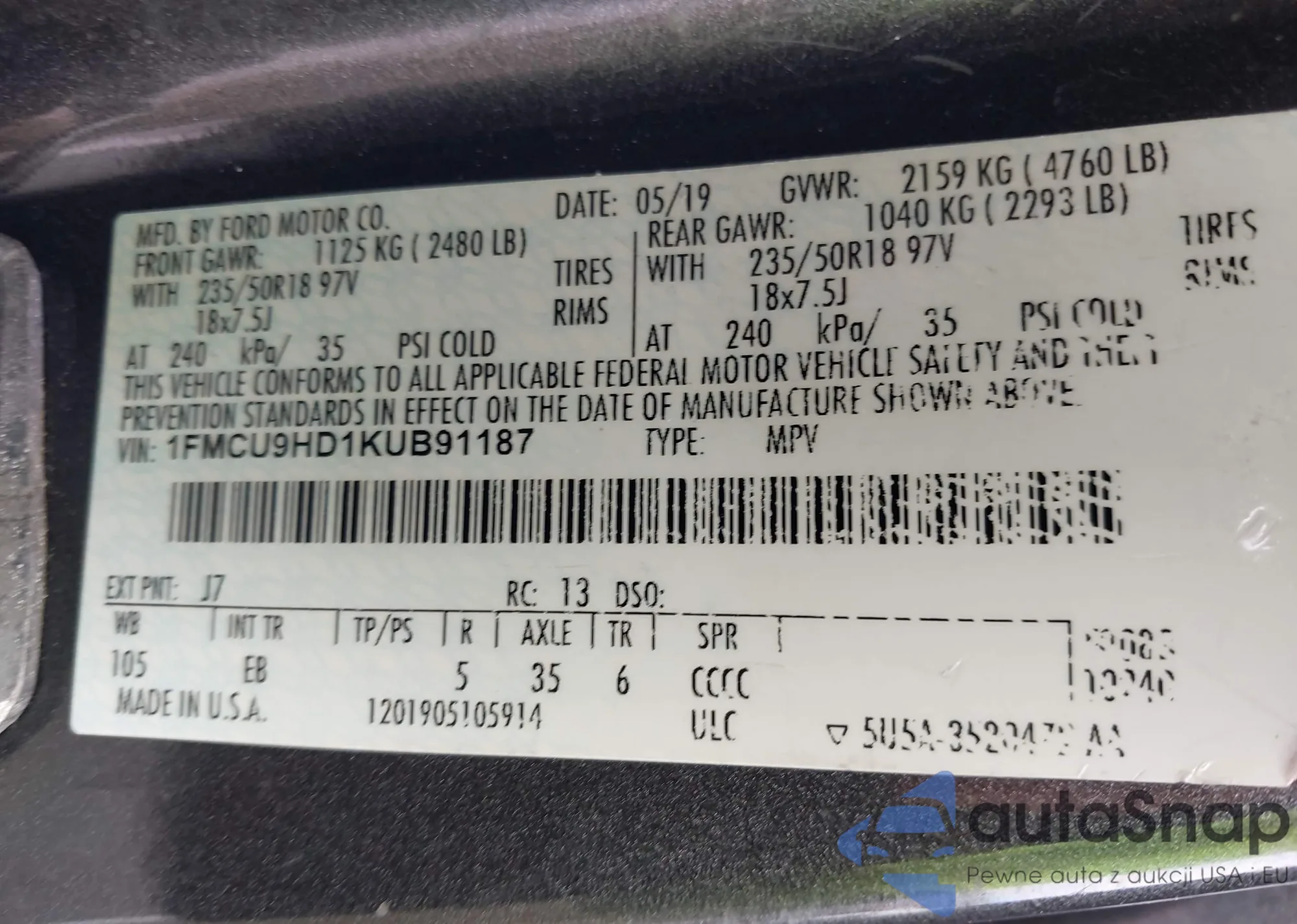 • VIN 1FMCU9HD1KUB91187