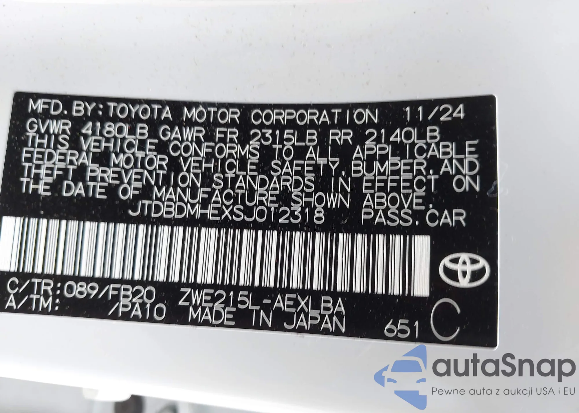 • VIN JTDBDMHEXSJ012318