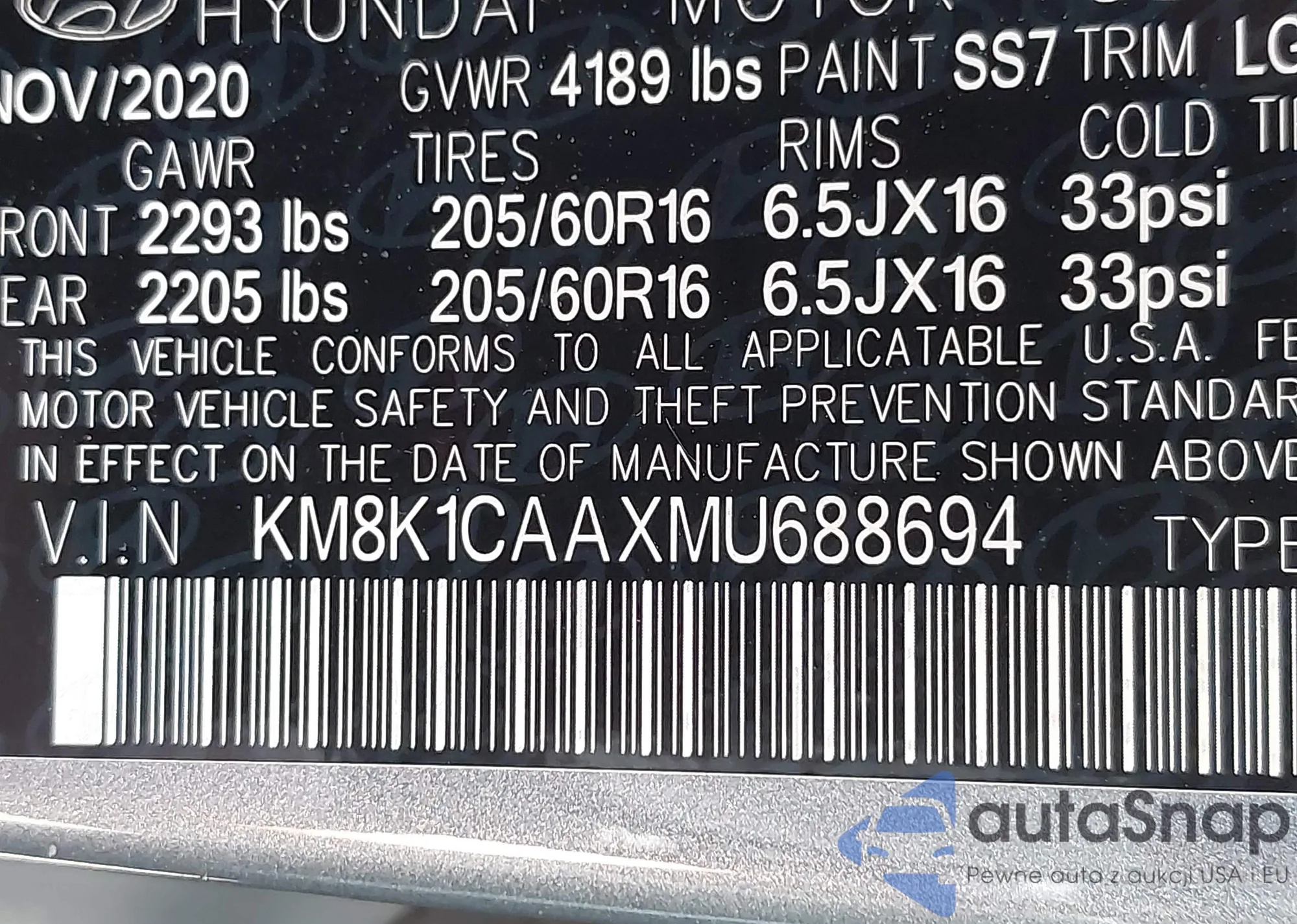 • VIN KM8K1CAAXMU688694