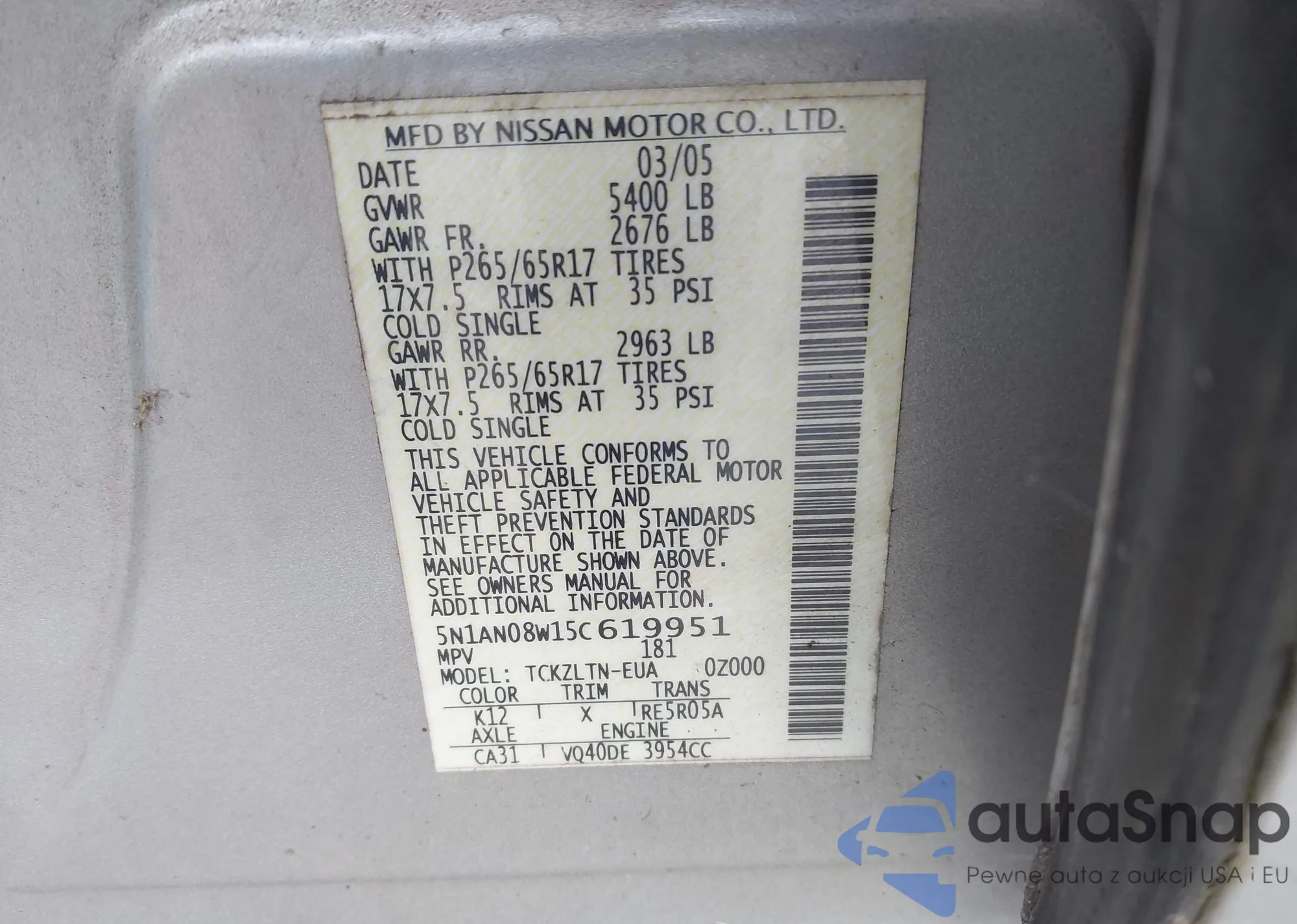 LOT: 43218350 VIN: 5N1AN08W15C619951