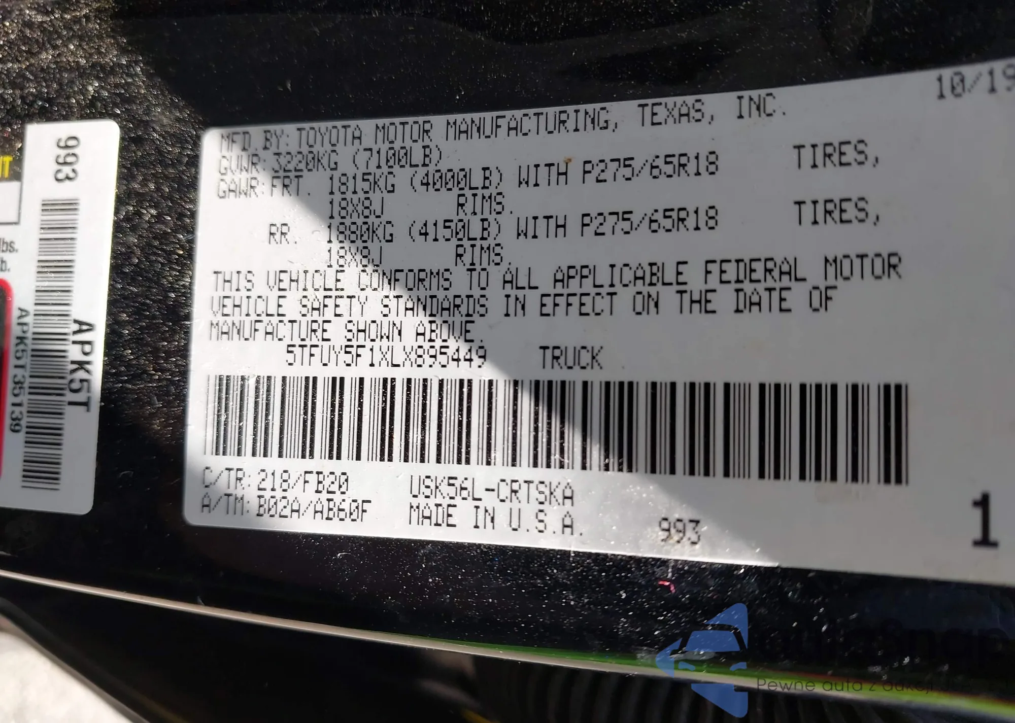 • VIN 5TFUY5F1XLX895449