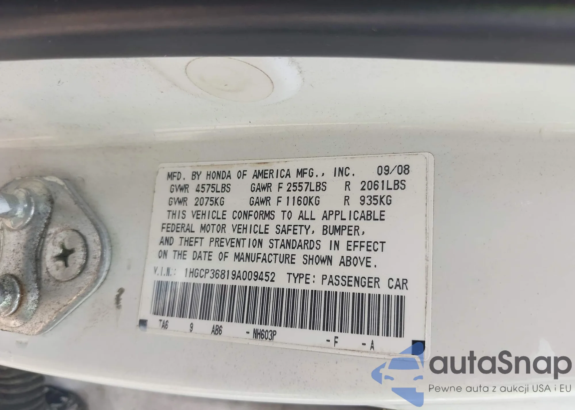 LOT: 42897743 VIN: 1HGCP36819A009452