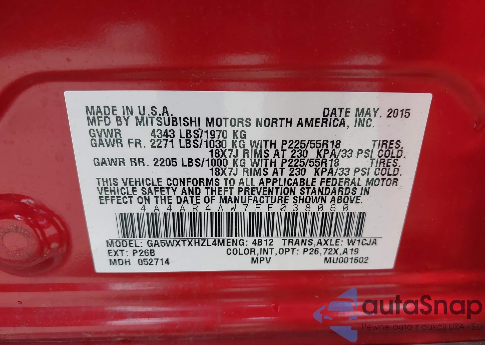 LOT: 42972911 VIN: 4A4AR4AW7FE038060