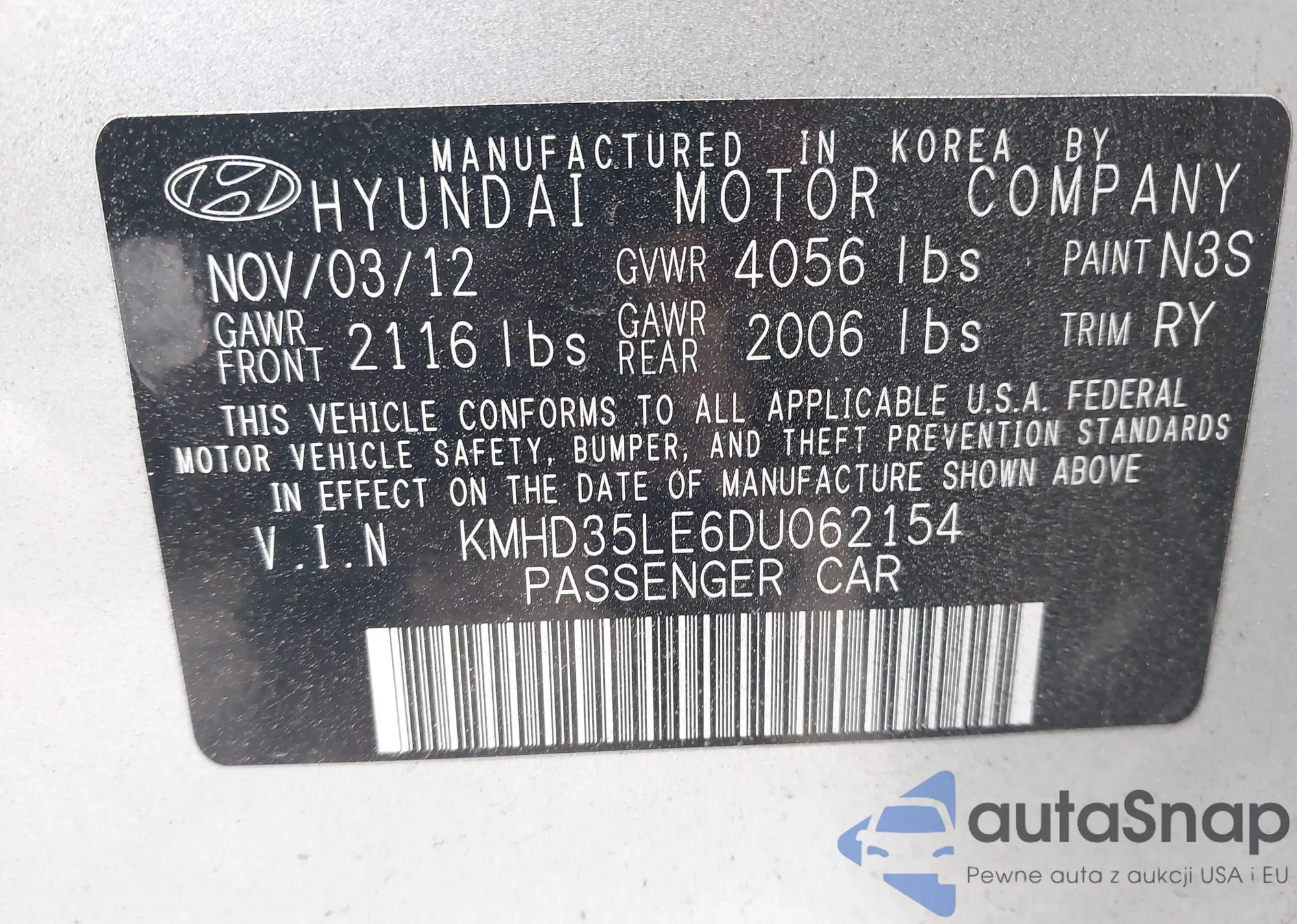 LOT: 42998181 VIN: KMHD35LE6DU062154