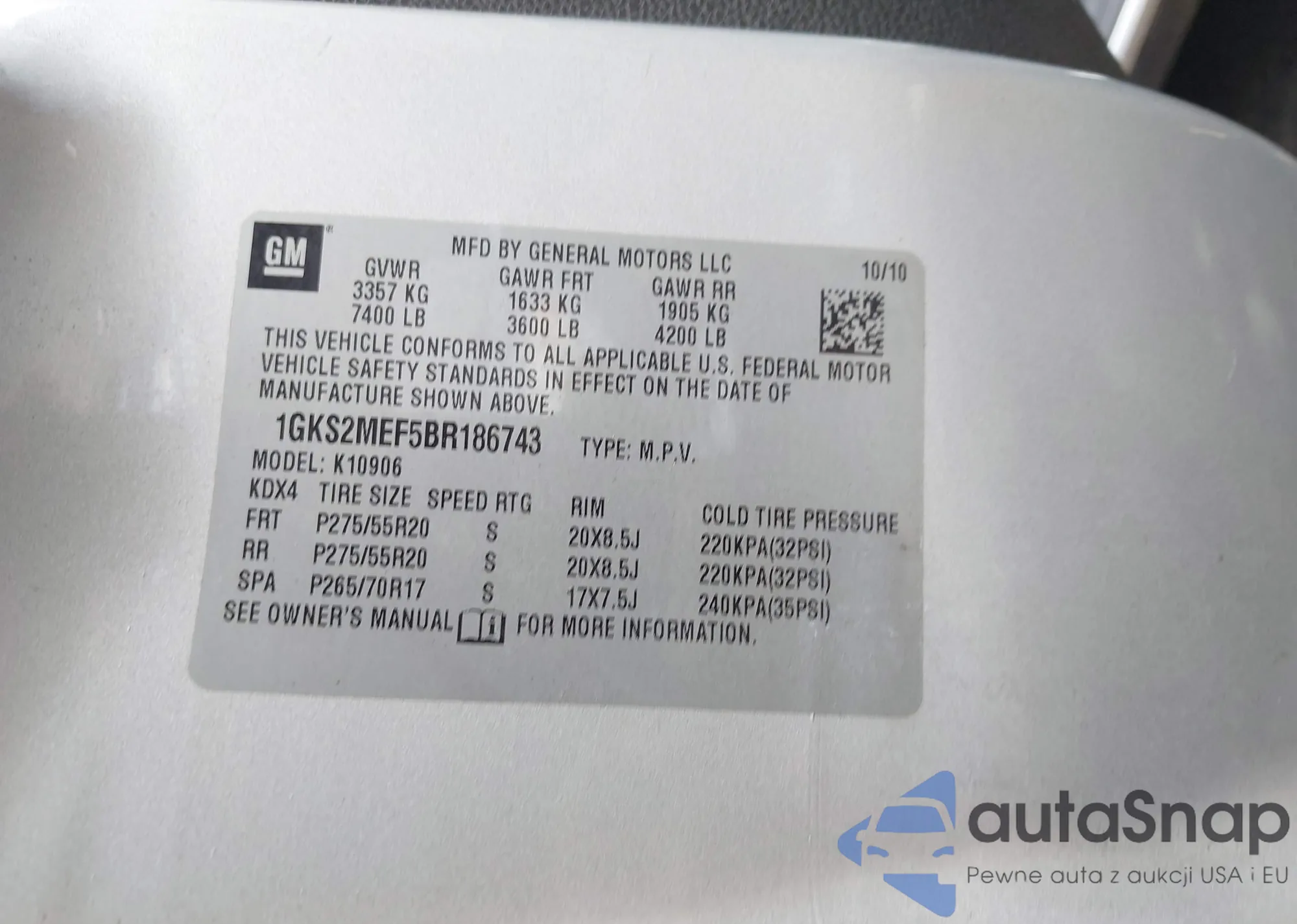 LOT: 43007415 VIN: 1GKS2MEF5BR186743