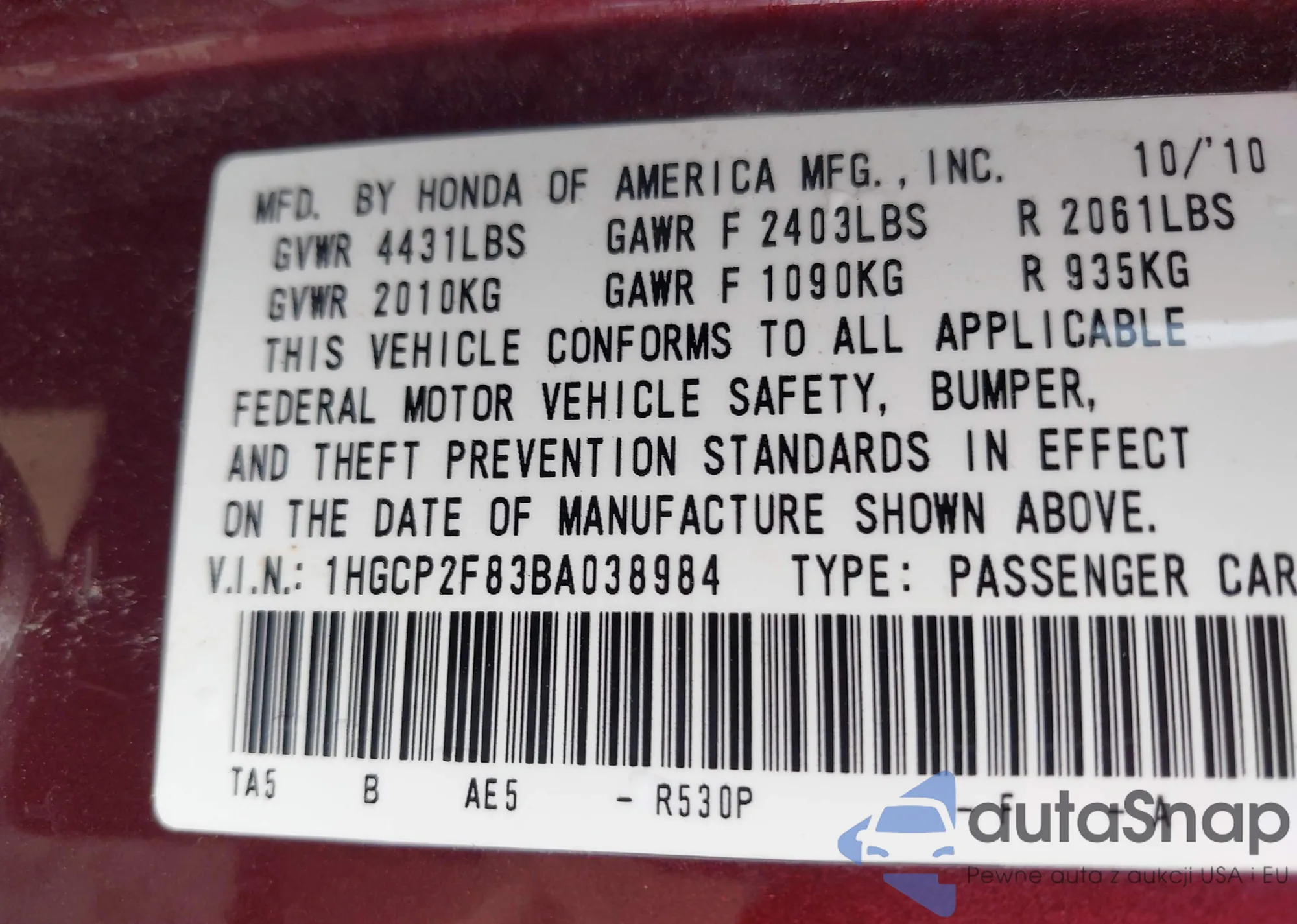LOT: 43164832 VIN: 1HGCP2F83BA038984