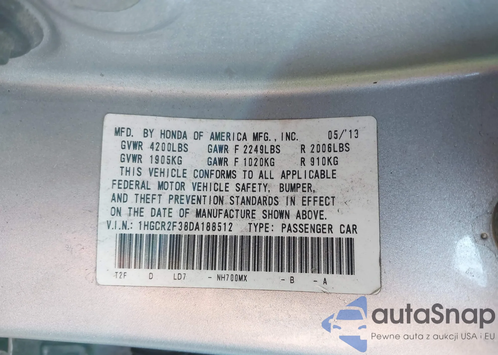 LOT: 43200693 VIN: 1HGCR2F38DA188512