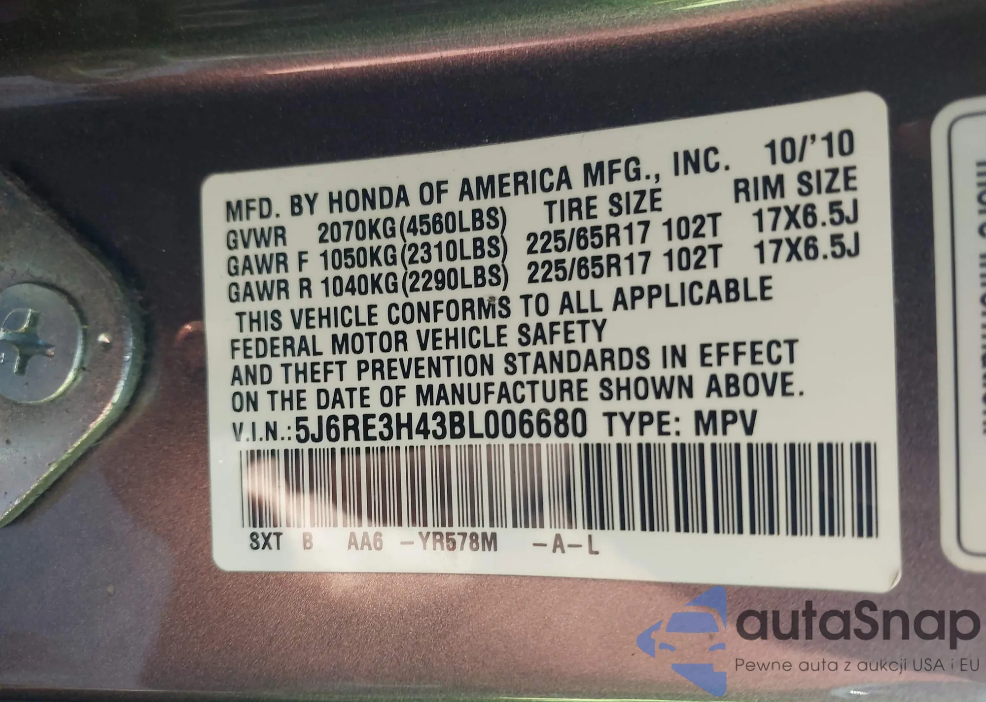• VIN 5J6RE3H43BL006680