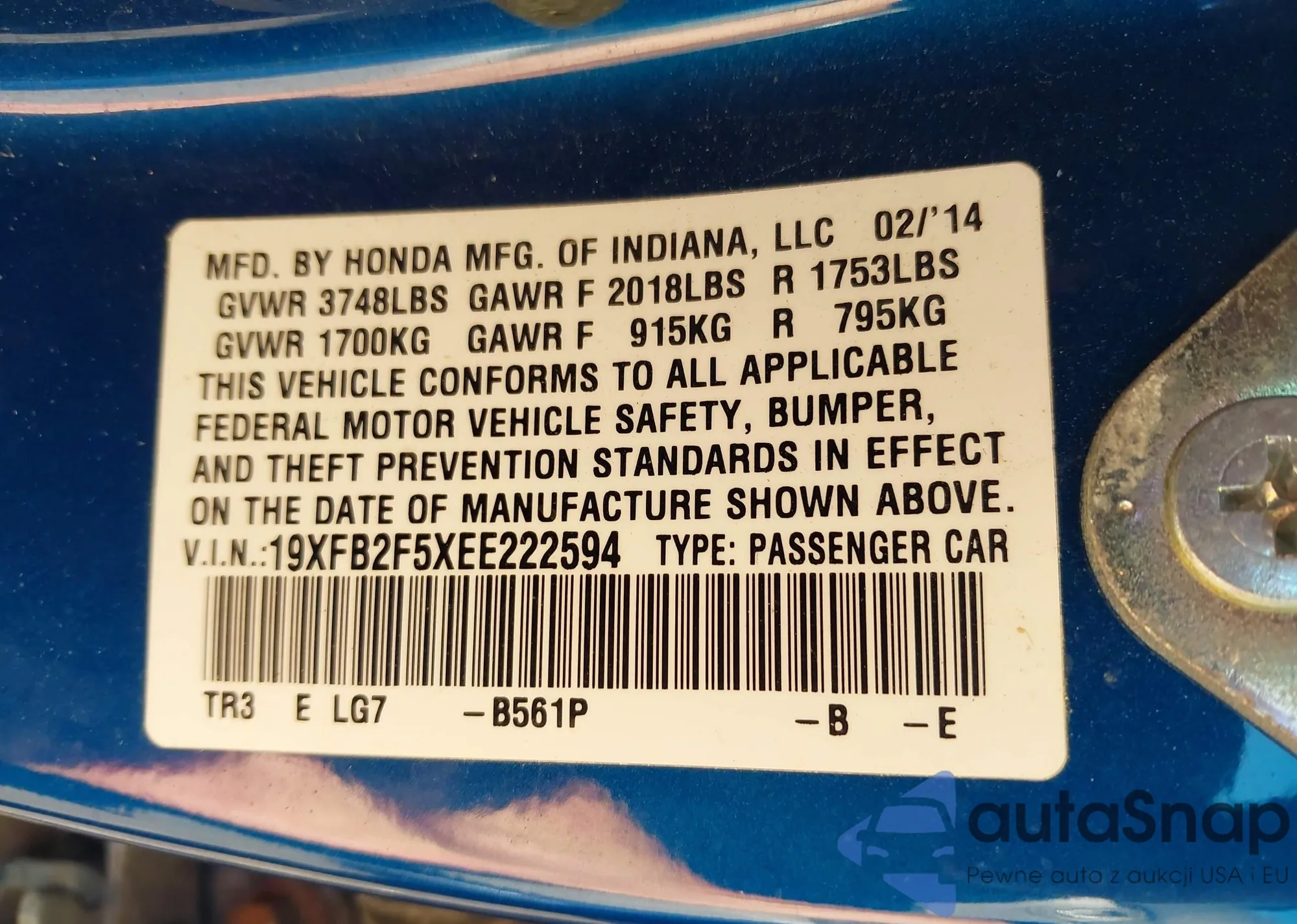 LOT: 43176894 VIN: 19XFB2F5XEE222594