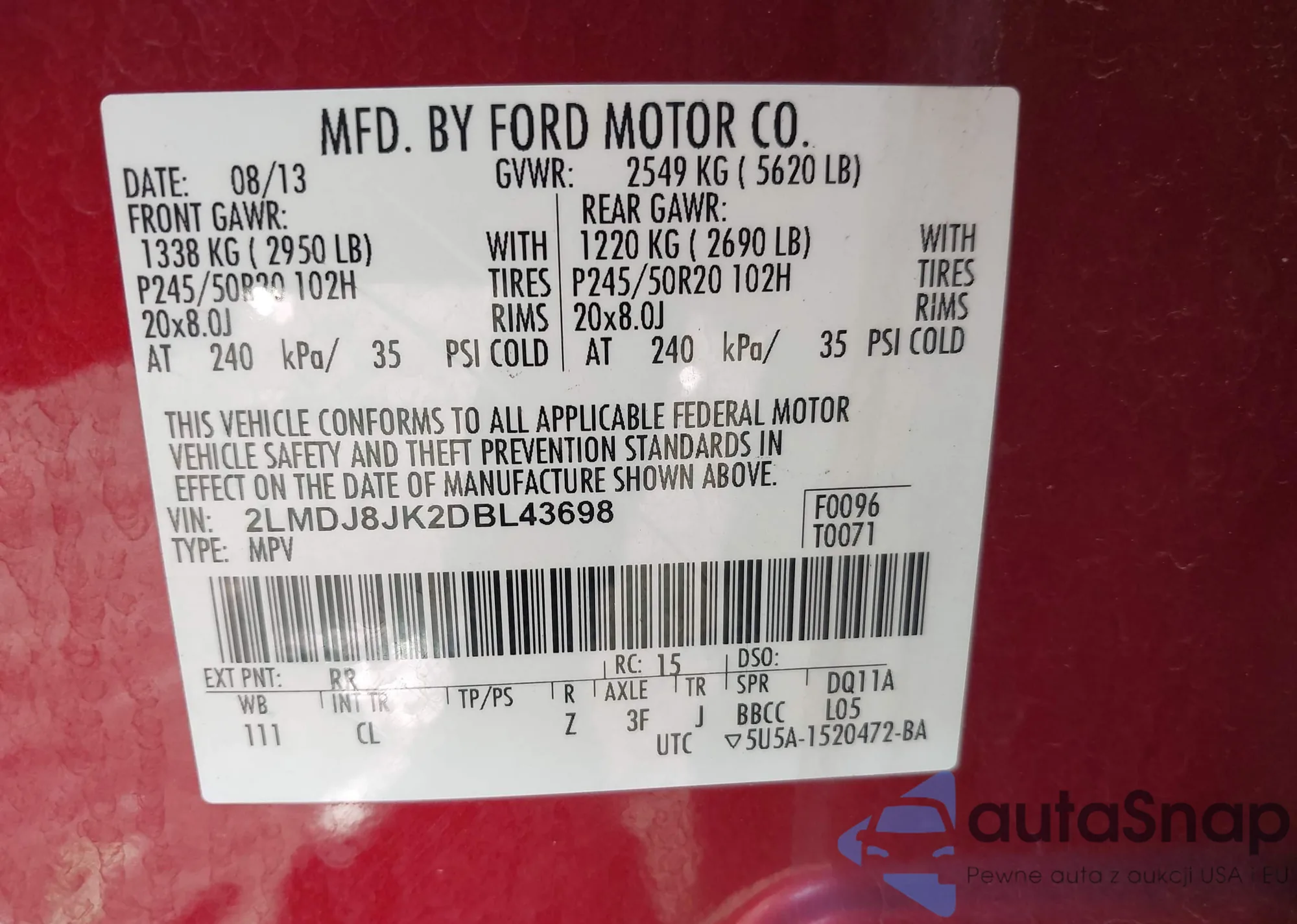 LOT: 43186330 VIN: 2LMDJ8JK2DBL43698