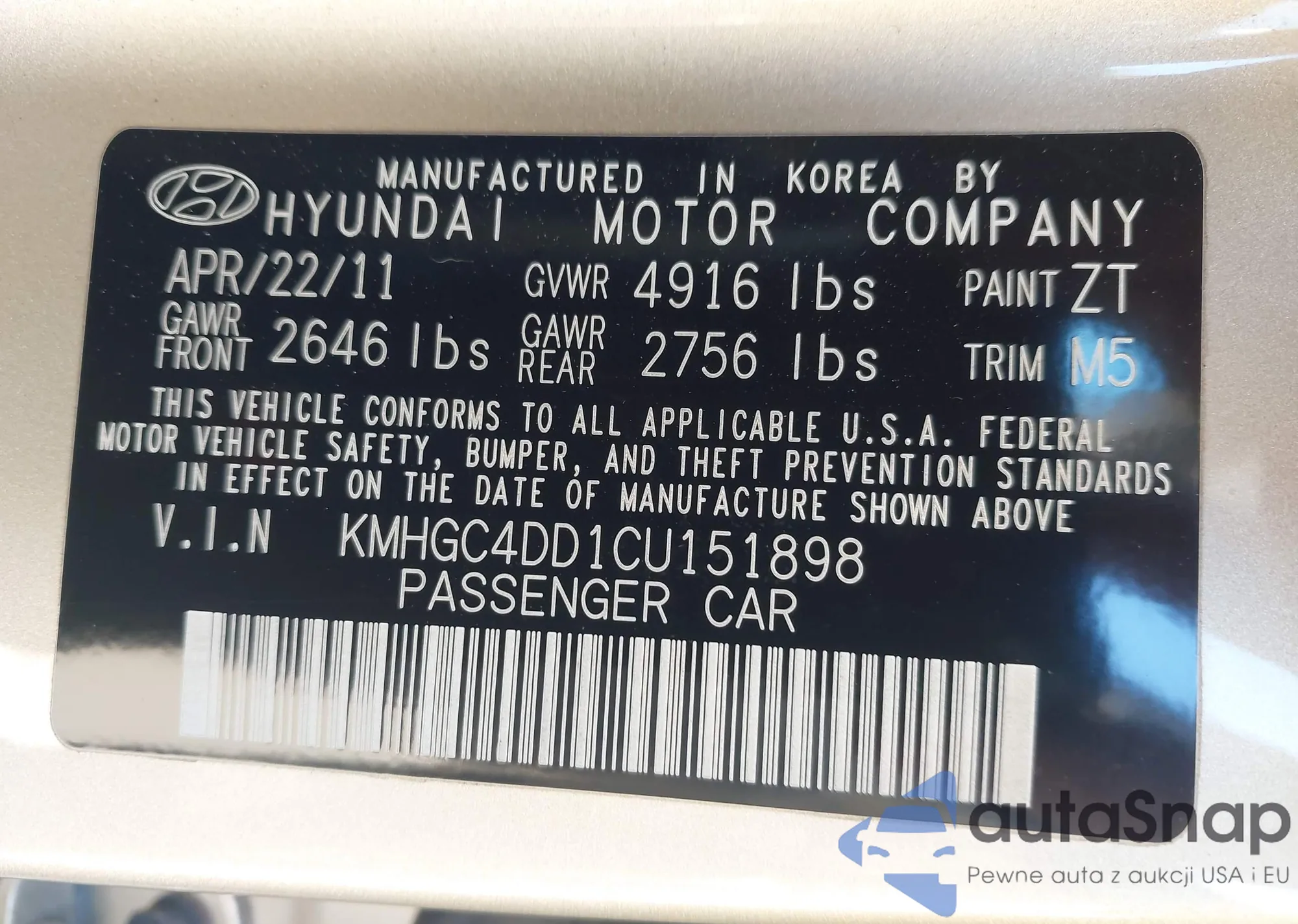 LOT: 43202122 VIN: KMHGC4DD1CU151898