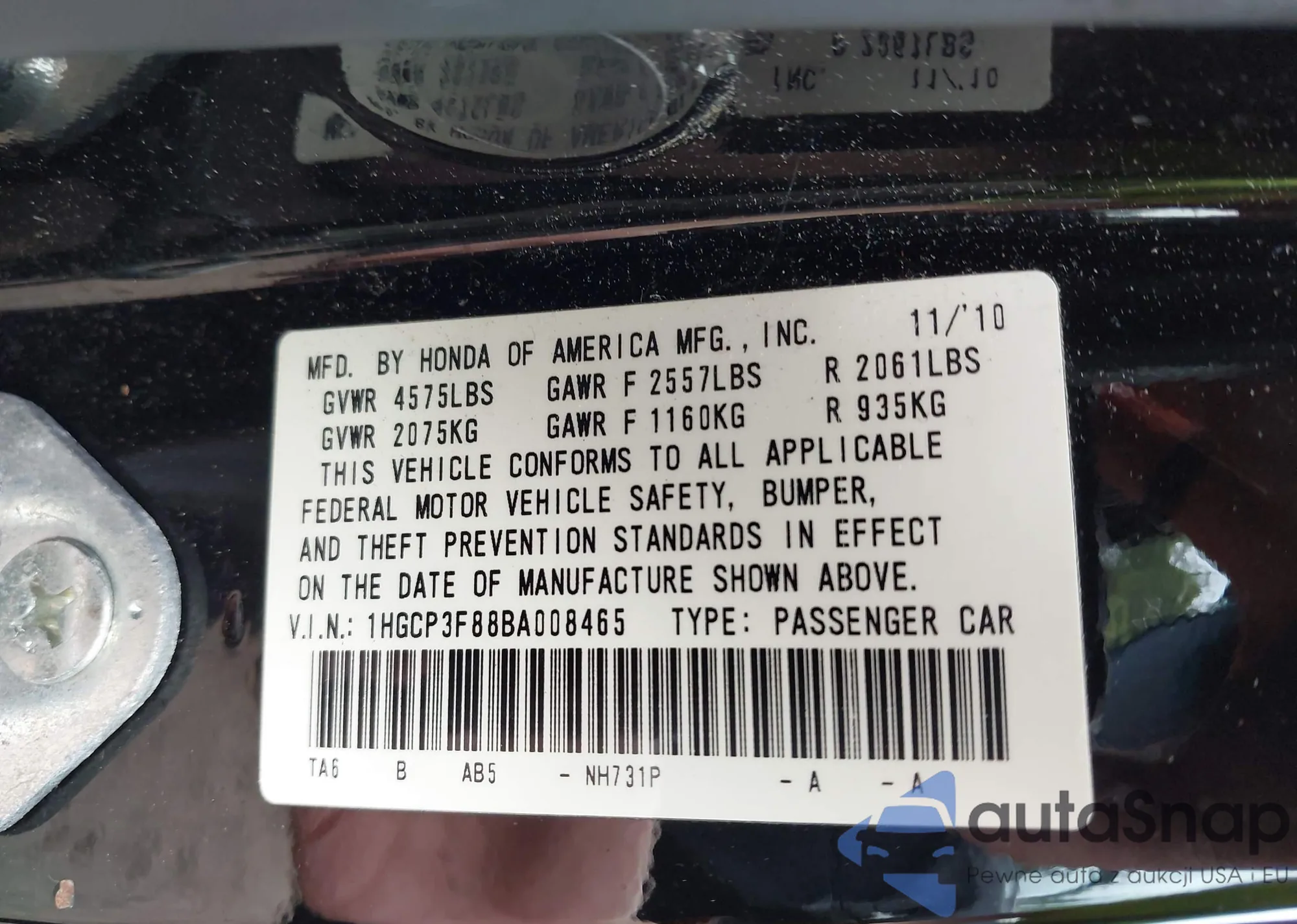 LOT: 43234265 VIN: 1HGCP3F88BA008465