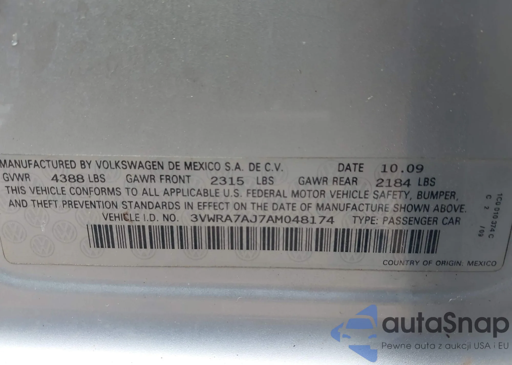 • VIN 3VWRA7AJ7AM048174