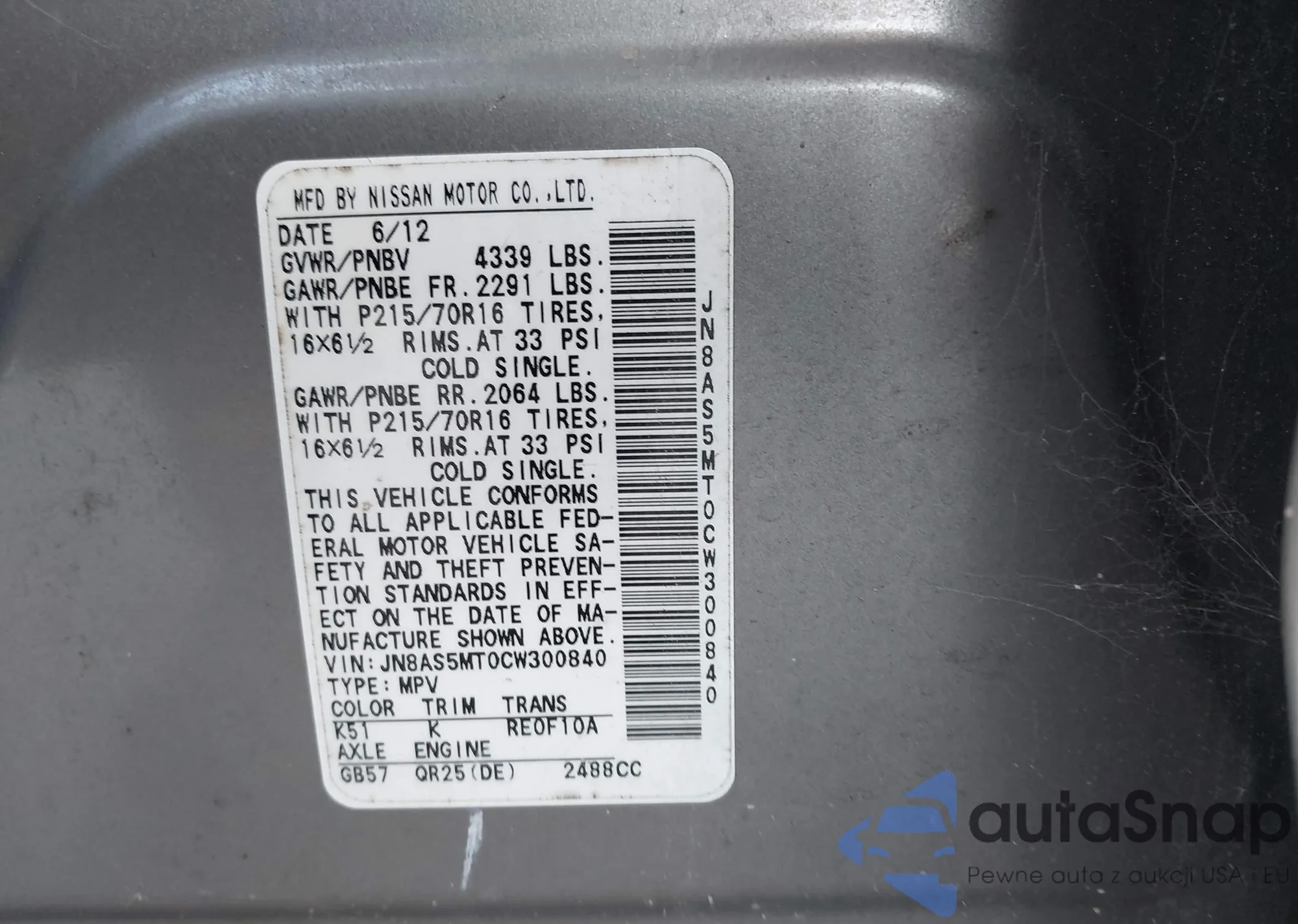 LOT: 42501046 VIN: JN8AS5MT0CW300840