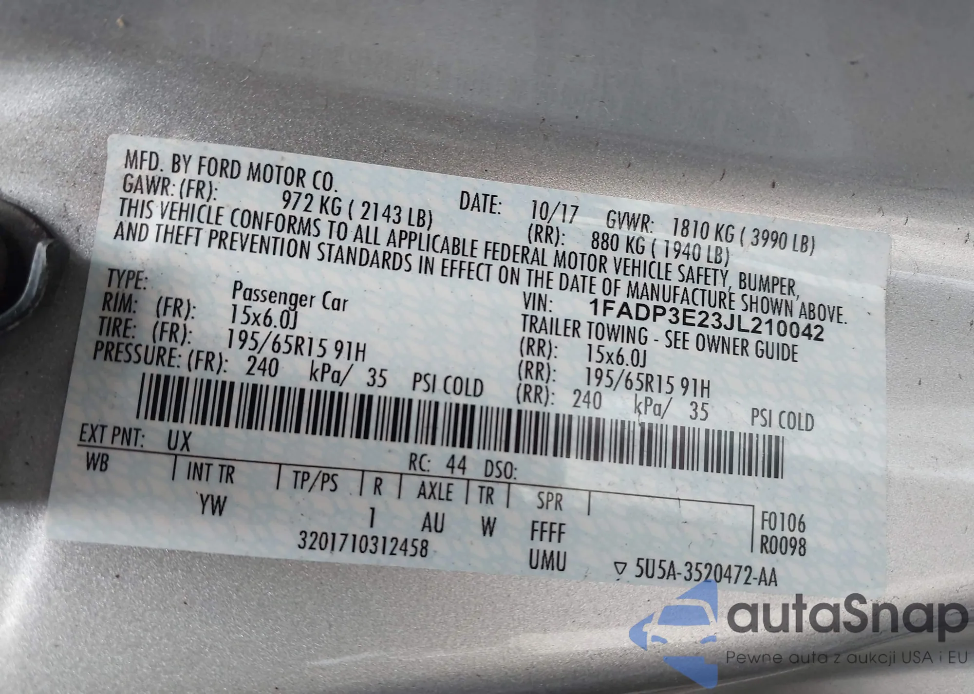 LOT: 43091633 VIN: 1FADP3E23JL210042