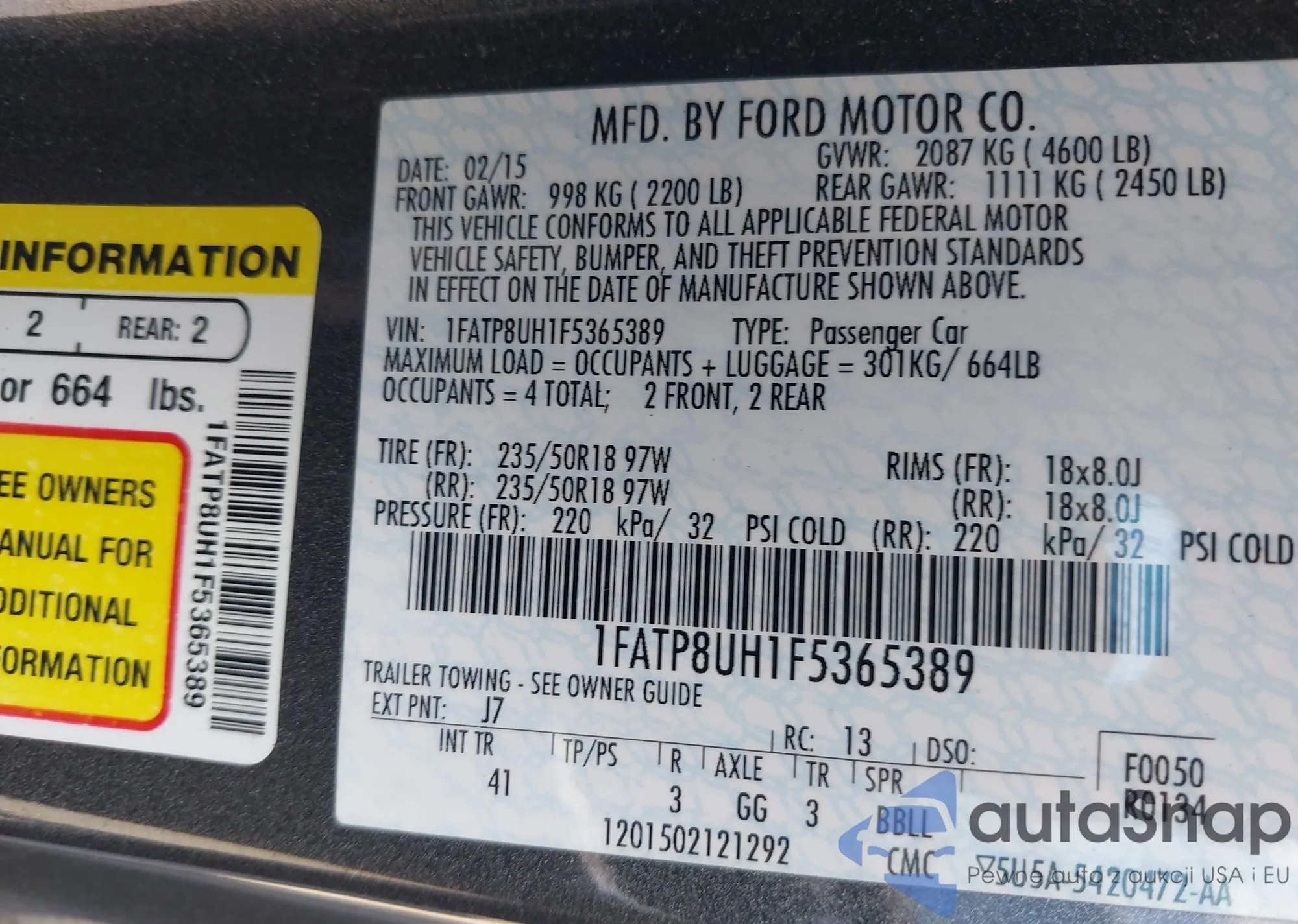 LOT: 43059924 VIN: 1FATP8UH1F5365389