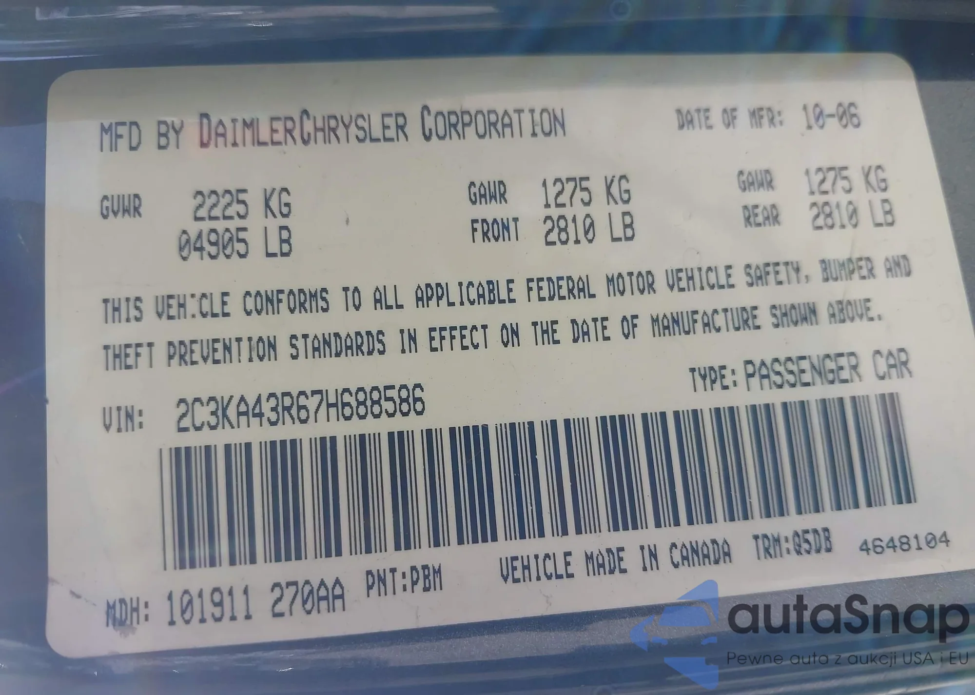 LOT: 43145843 VIN: 2C3KA43R67H688586