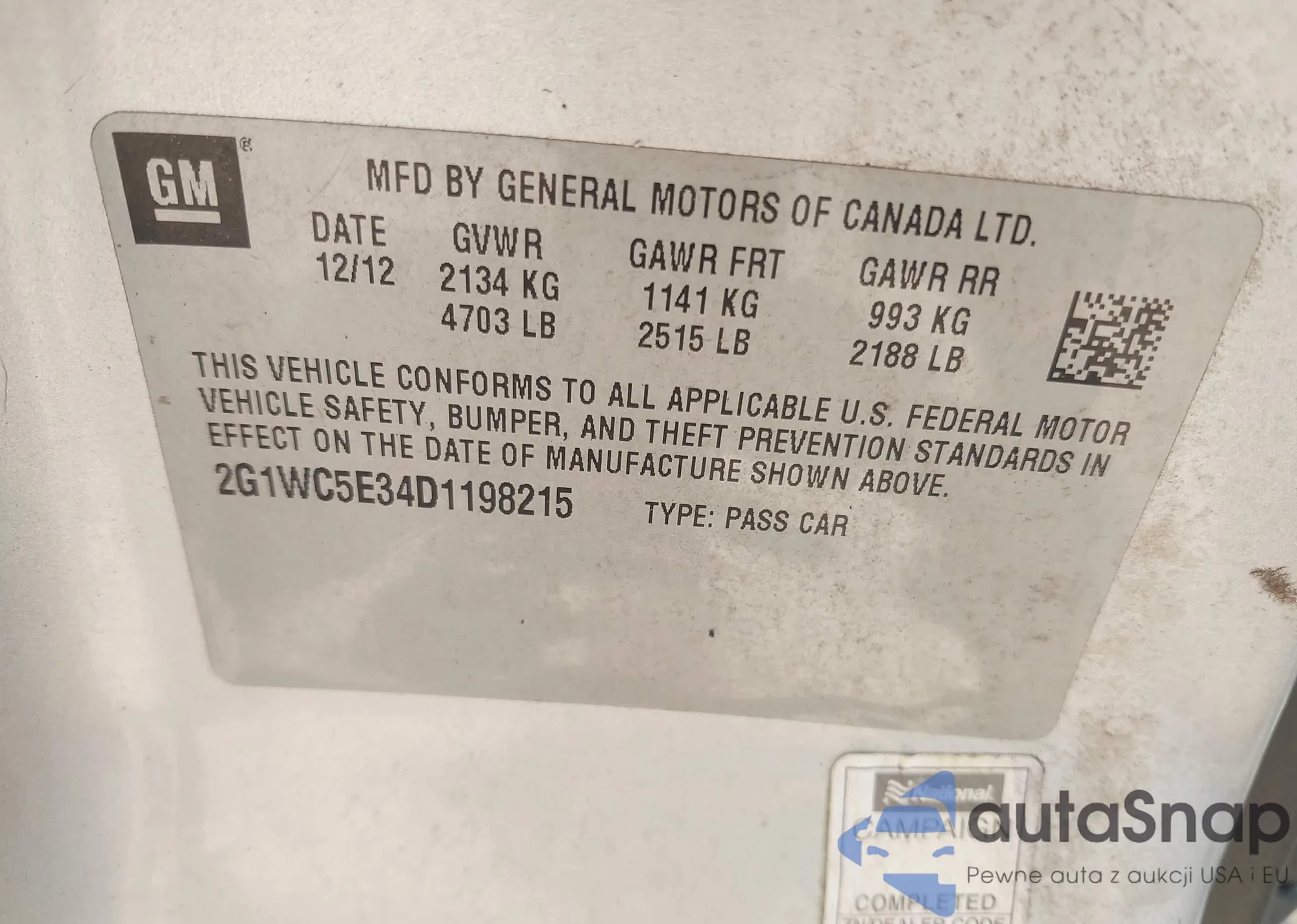 LOT: 43156737 VIN: 2G1WC5E34D1198215