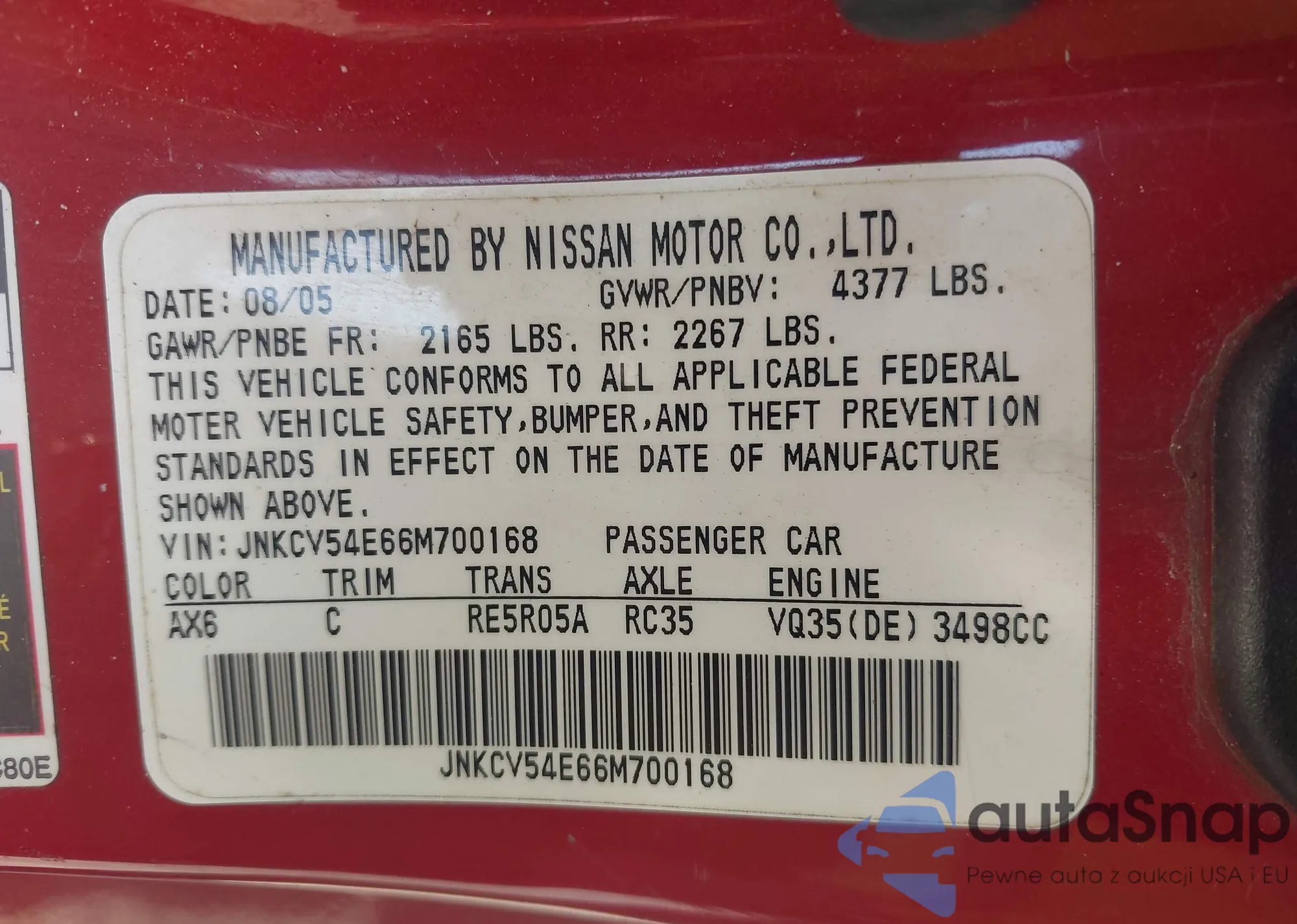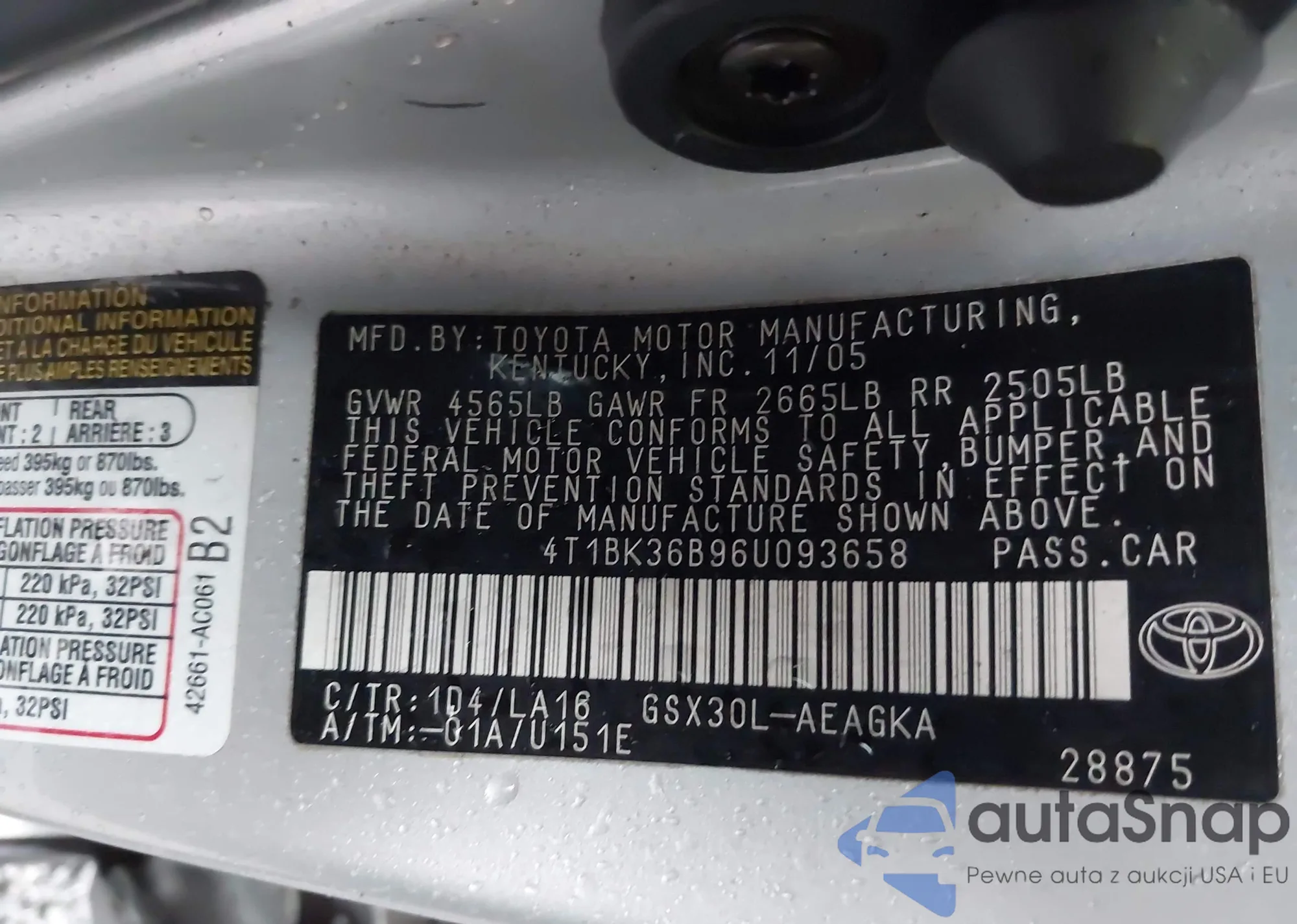 LOT: 43172619 VIN: 4T1BK36B96U093658