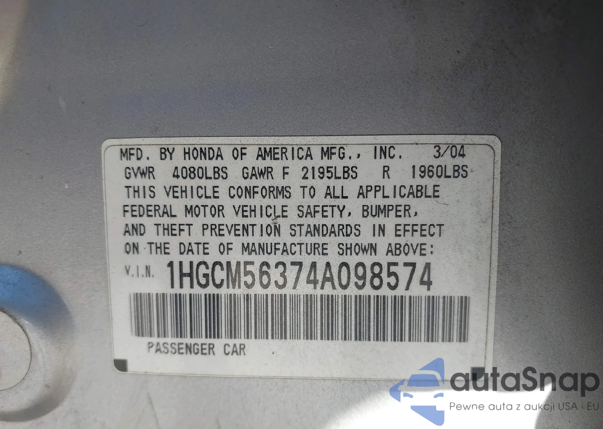 LOT: 43223894 VIN: 1HGCM56374A098574