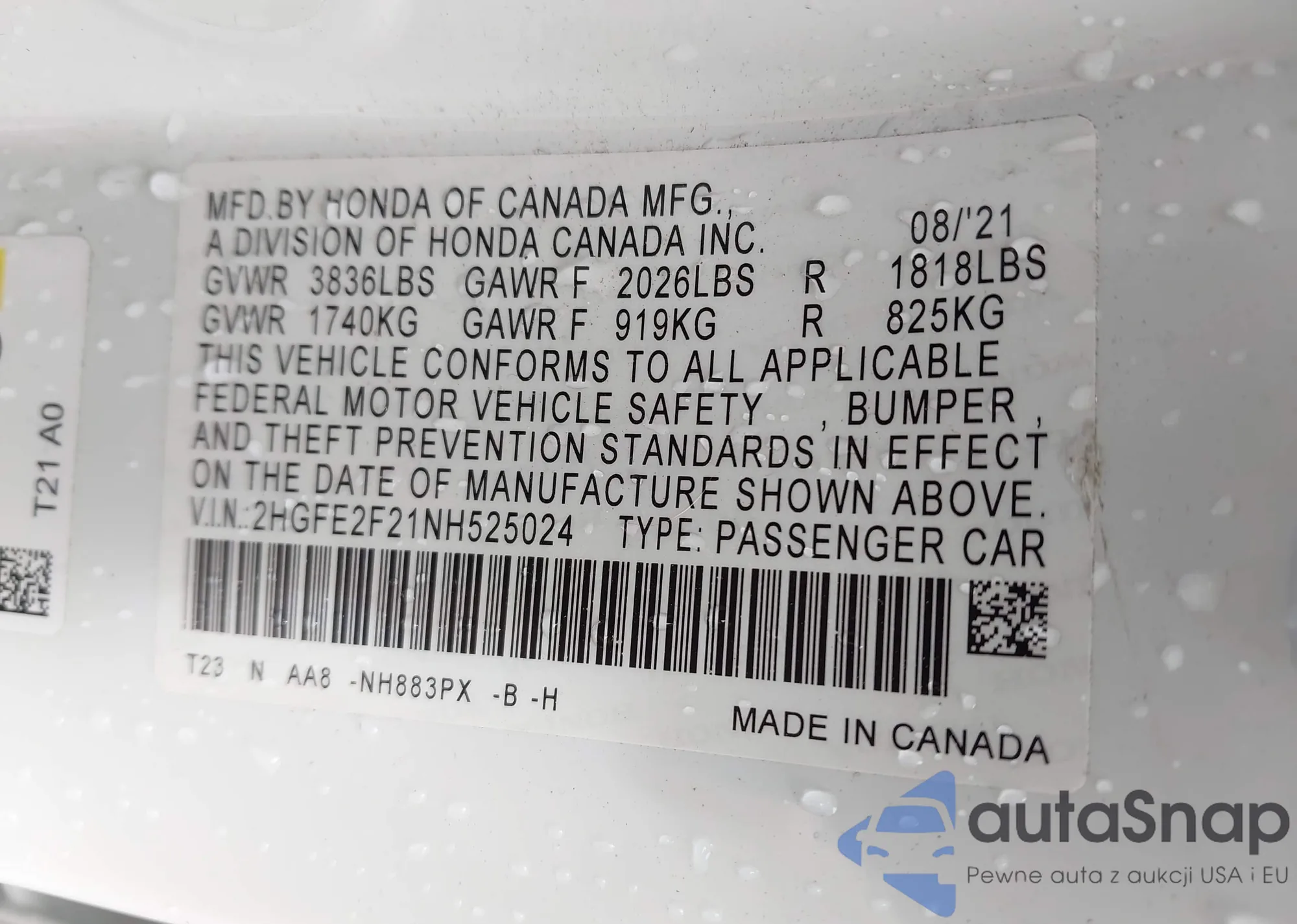 LOT: 43022799 VIN: 2HGFG3B5XCH555796