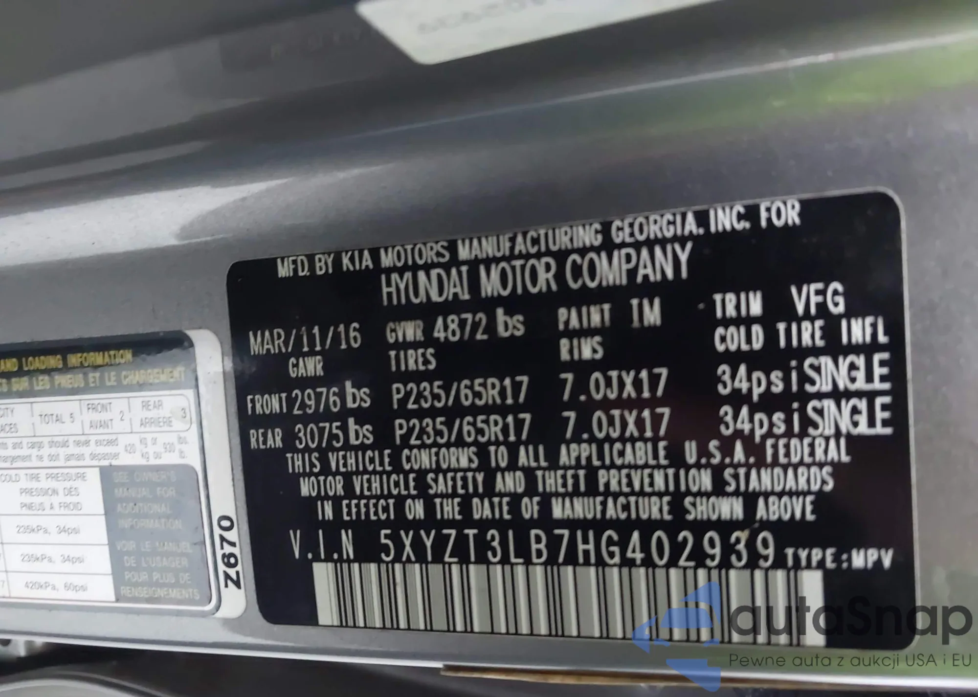 • VIN 5XYZT3LB7HG402939
