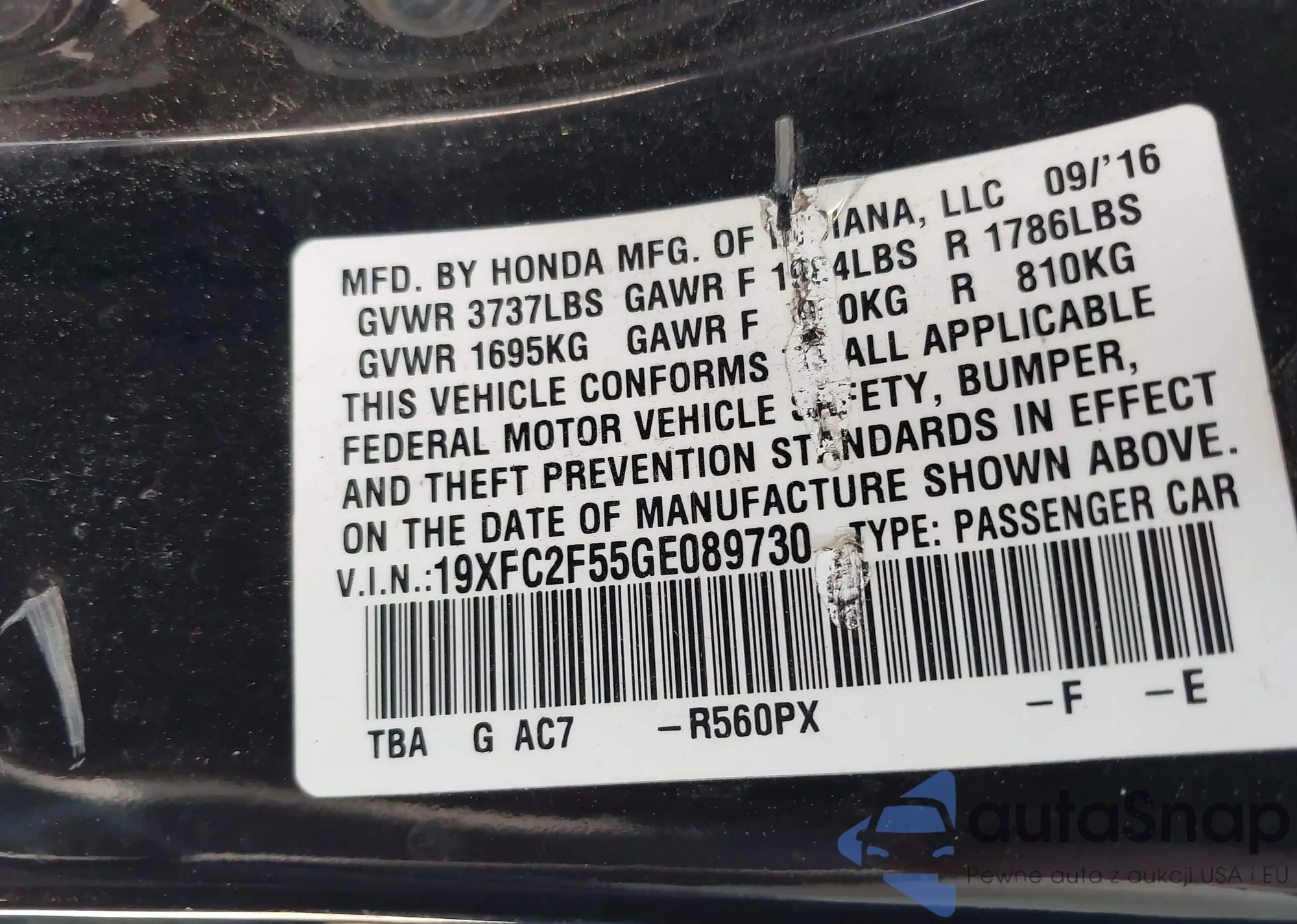 LOT: 42898323 VIN: 19XFC2F55GE089730