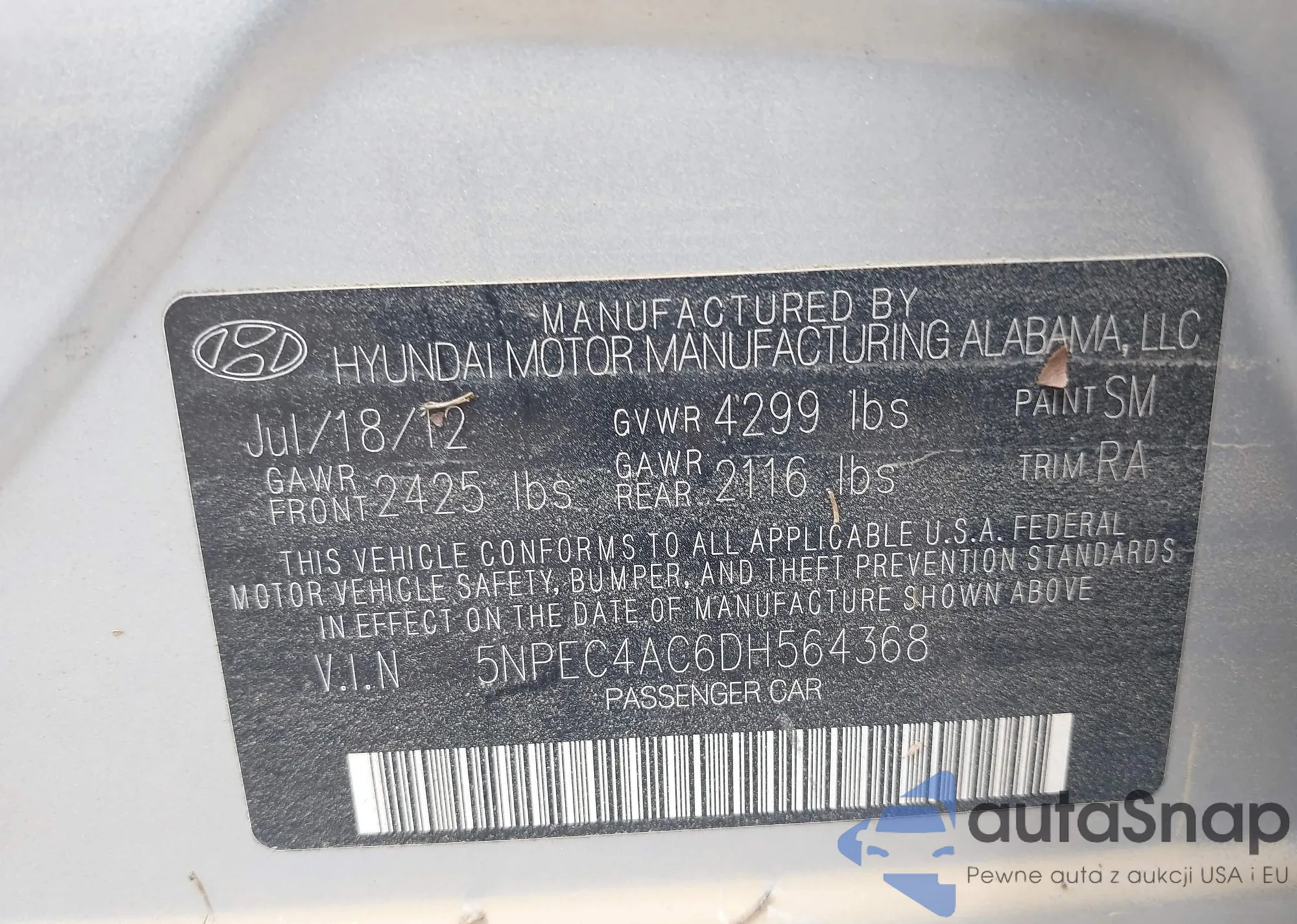 LOT: 42908249 VIN: 5NPEC4AC6DH564368