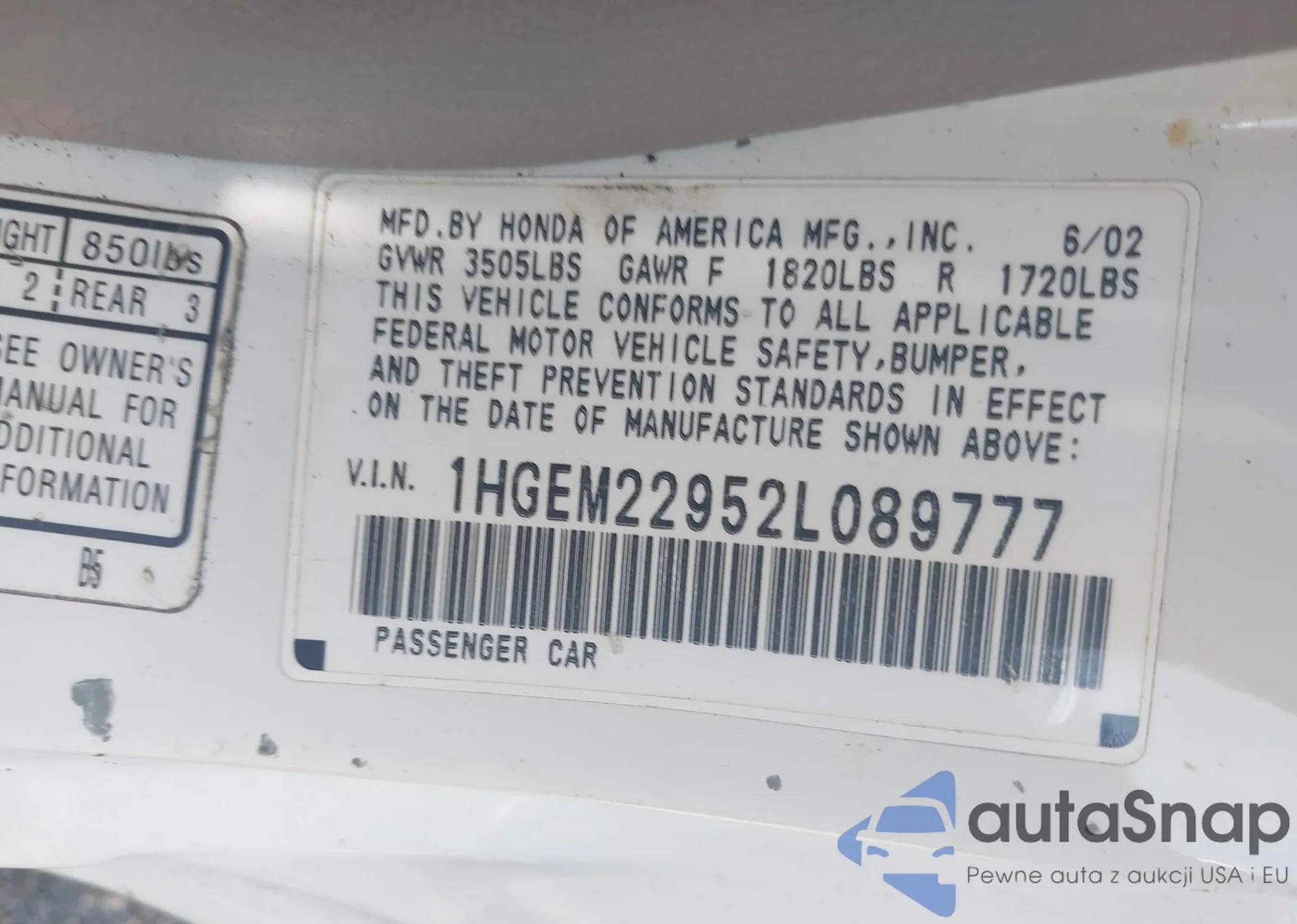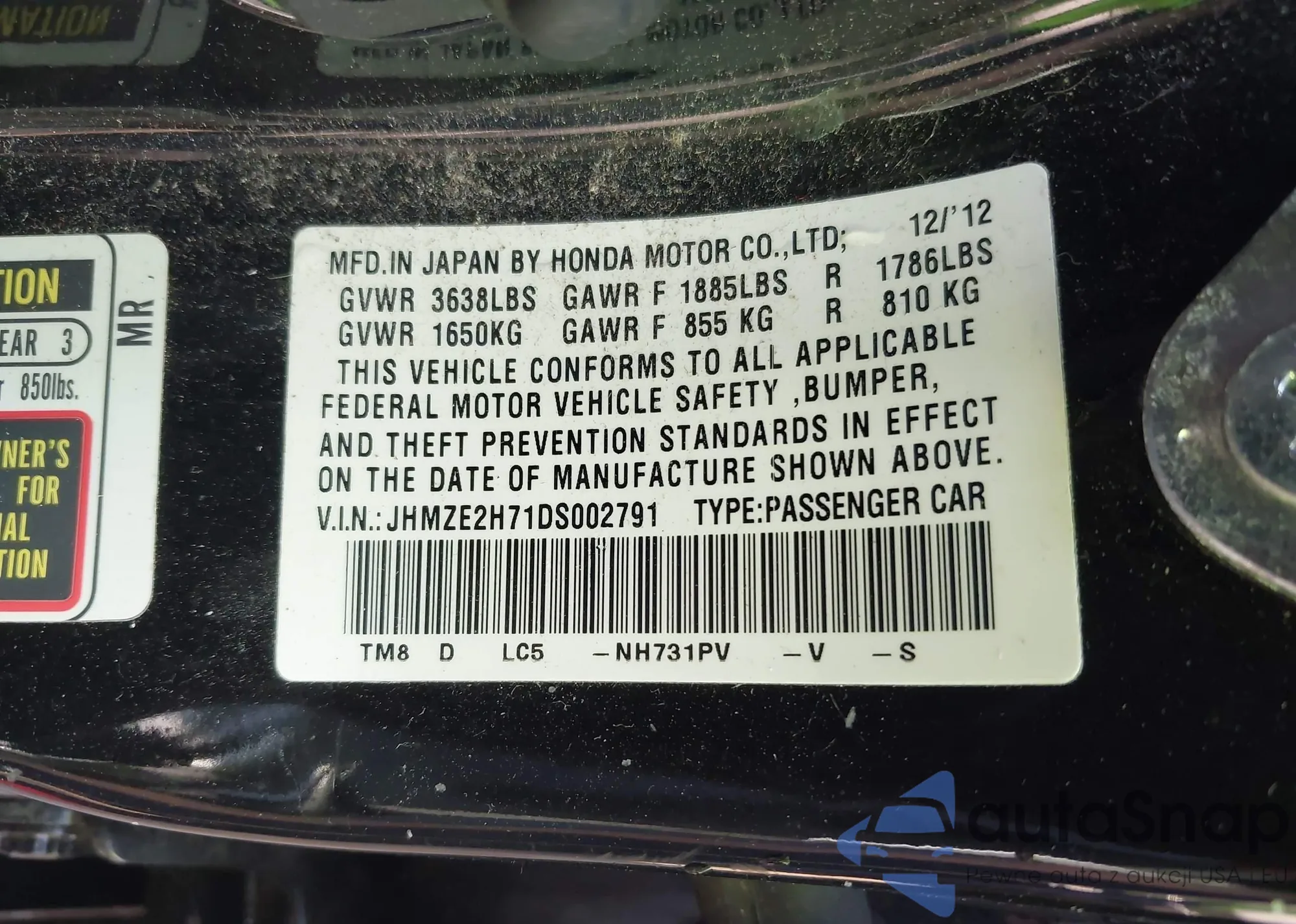 LOT: 42788273 VIN: JHMZE2H71DS002791