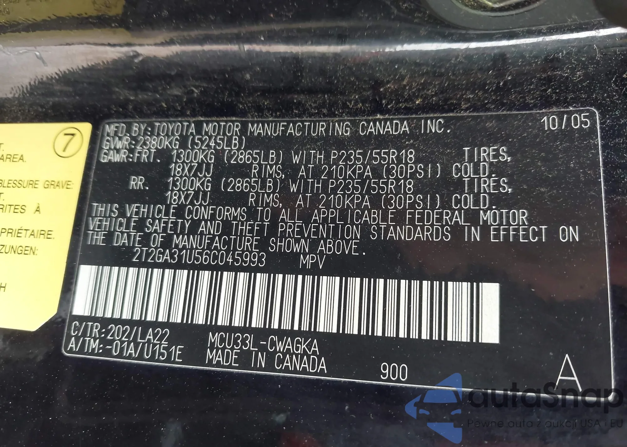 LOT: 42871239 VIN: 4T1BK36B35U018792