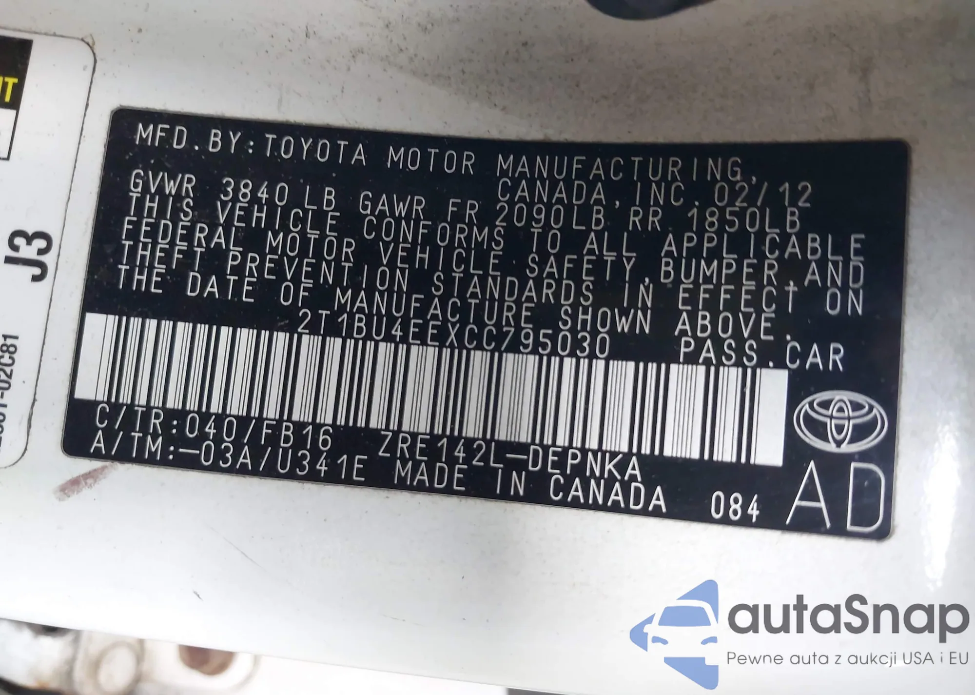 LOT: 42708595 VIN: 2T1BURHE6KC214369