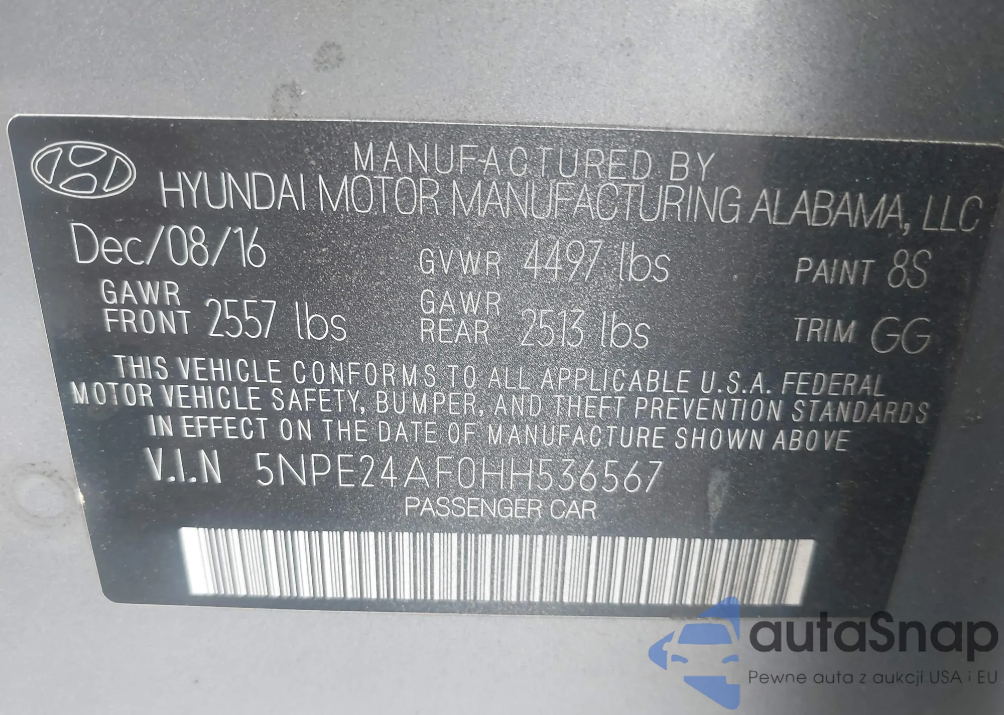 • VIN 5NPE24AF0HH536567