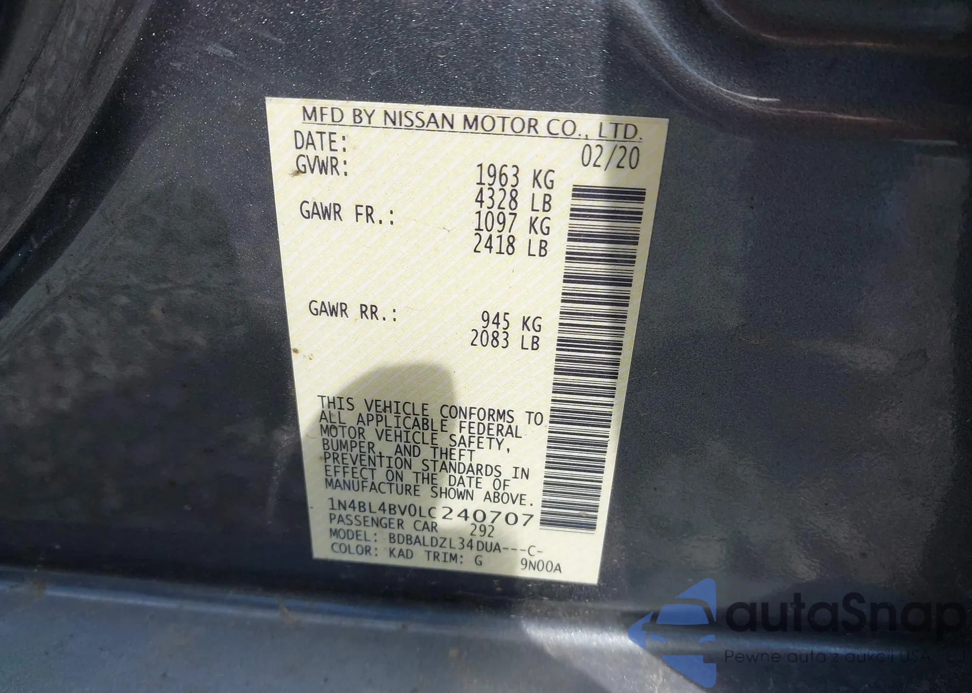LOT: 42710041 VIN: 1N4BL4BV0LC240707