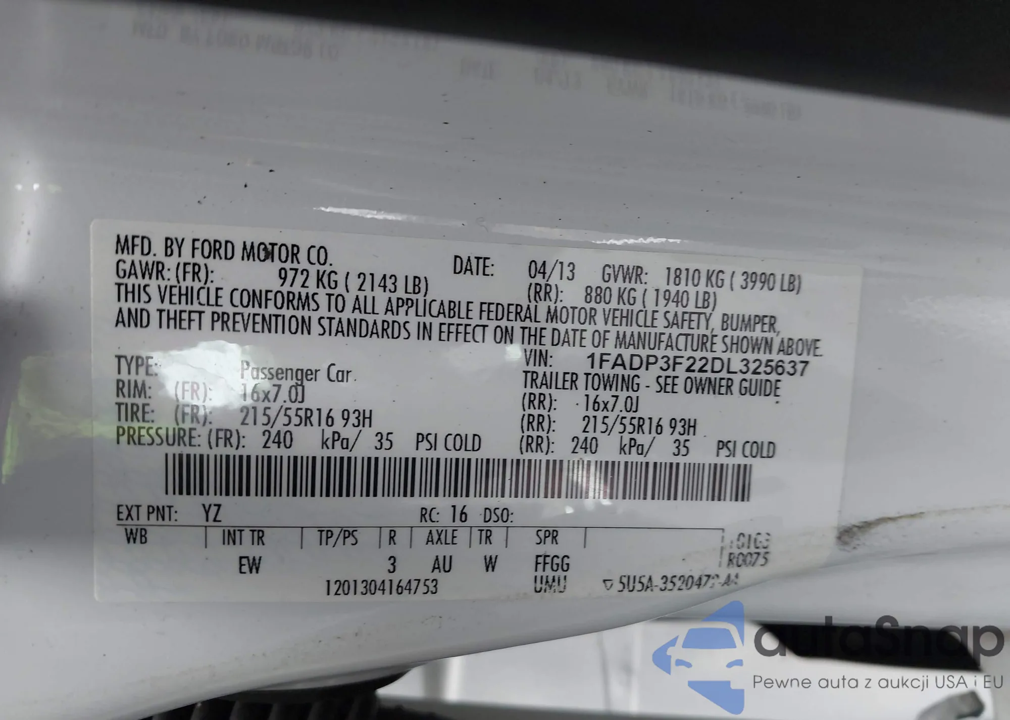LOT: 42923079 VIN: 1FADP3F22DL325637