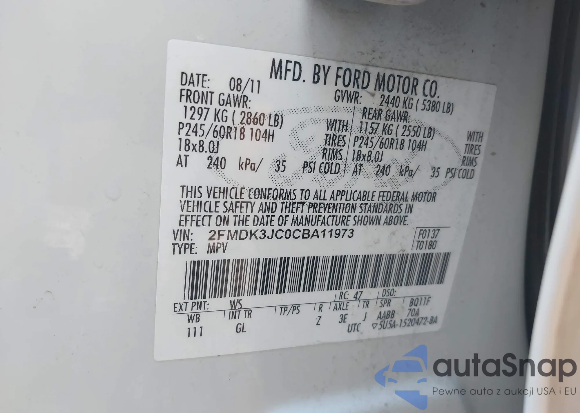 LOT: 42948455 VIN: 2FMDK3JC0CBA11973