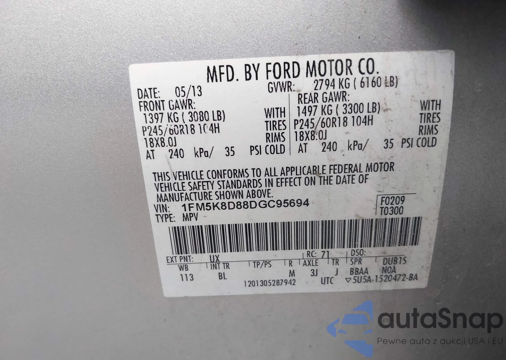 LOT: 42764541 VIN: 1FM5K8D88DGC95694