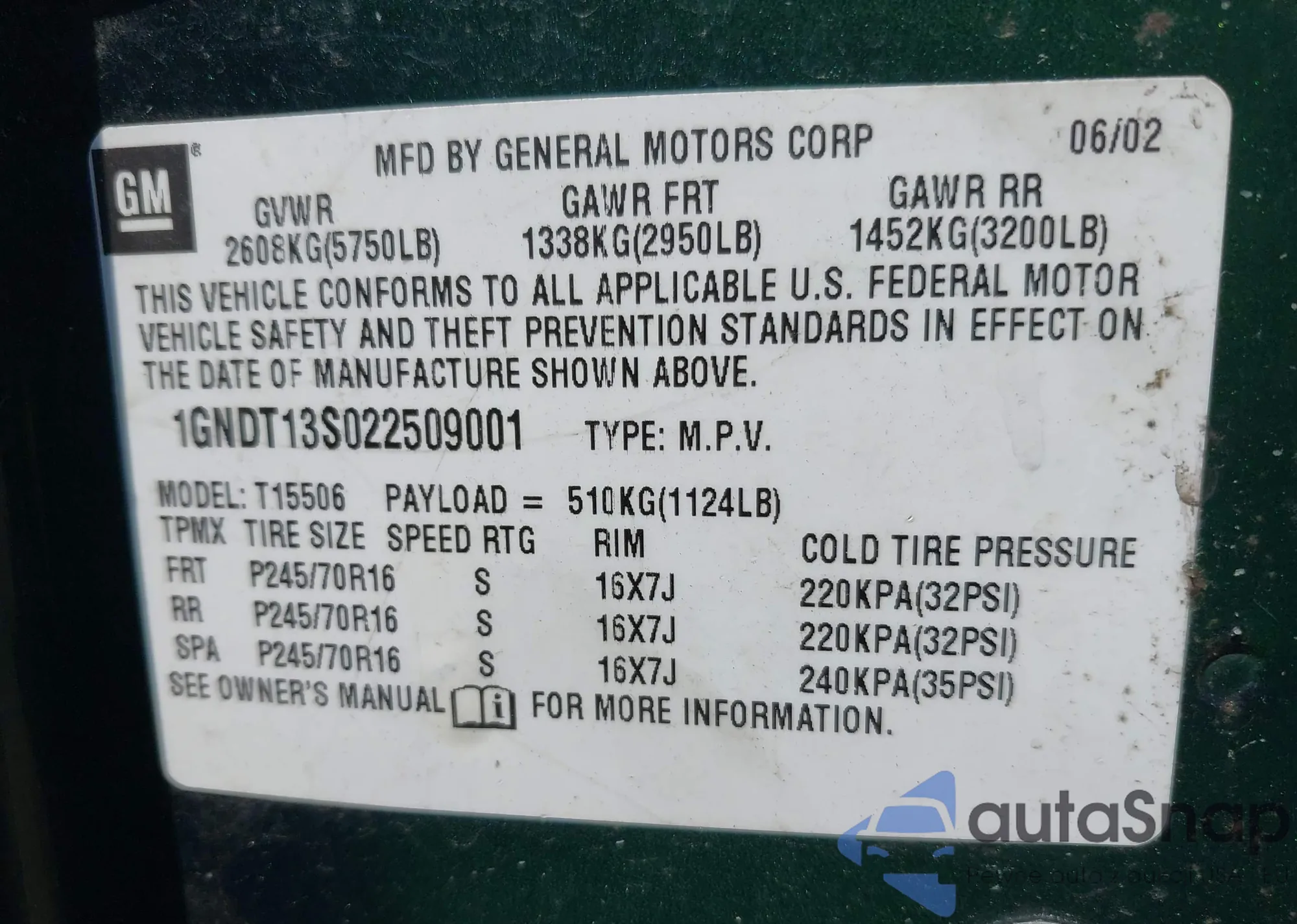 LOT: 42859571 VIN: 1GNDT13S022509001