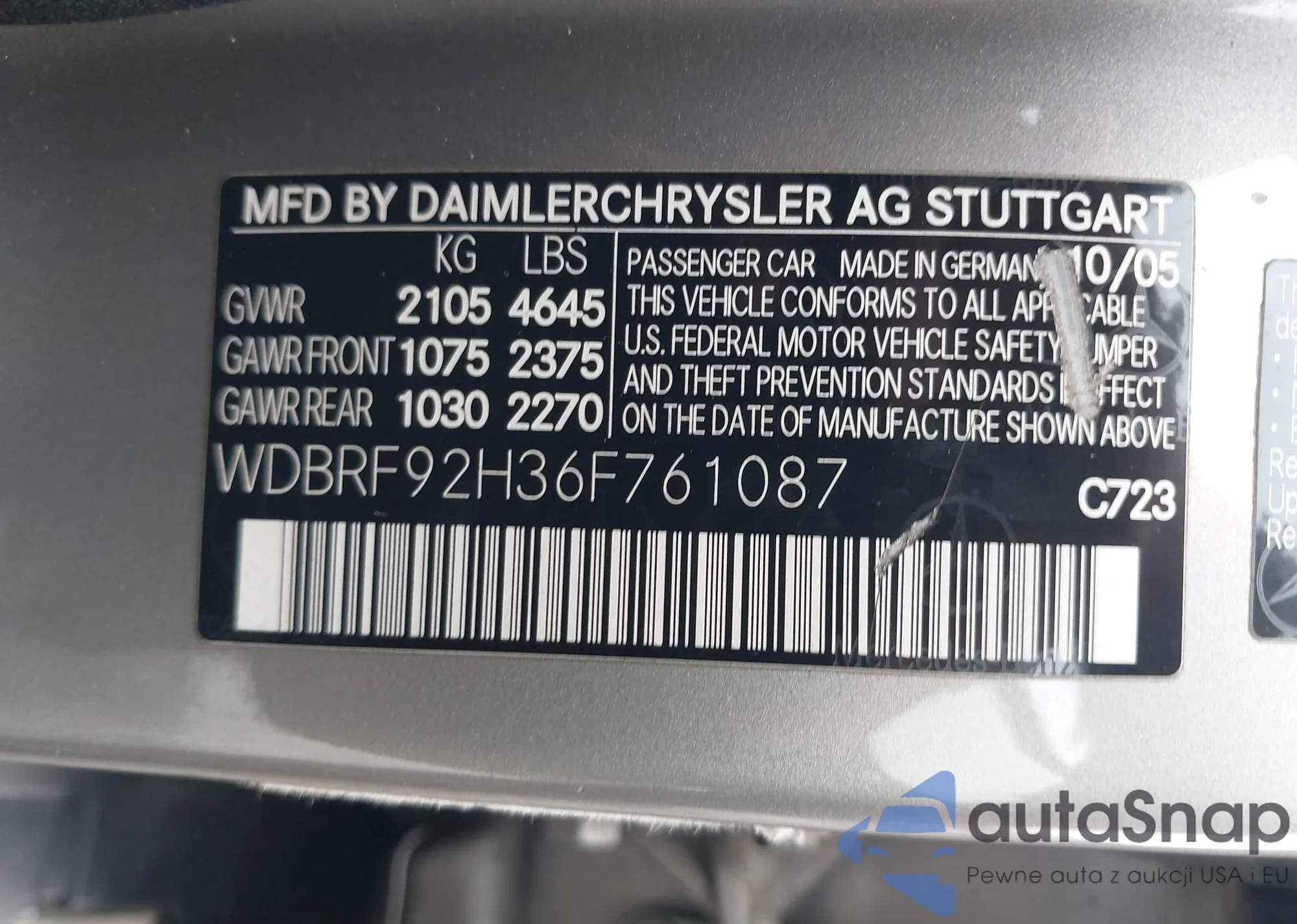 LOT: 42891870 VIN: WDBRF92H36F761087