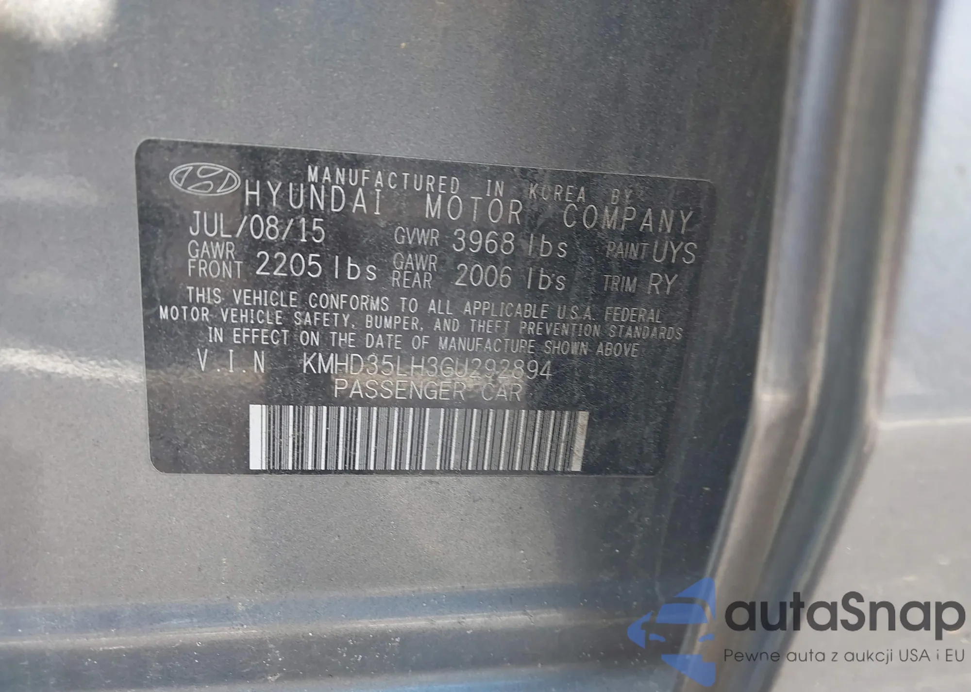 LOT: 42942590 VIN: KMHD35LH3GU292894