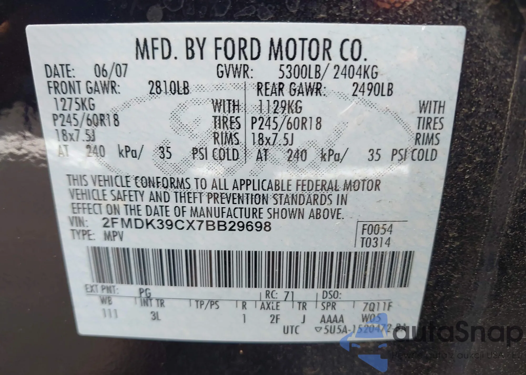 • VIN 2FMDK39CX7BB29698