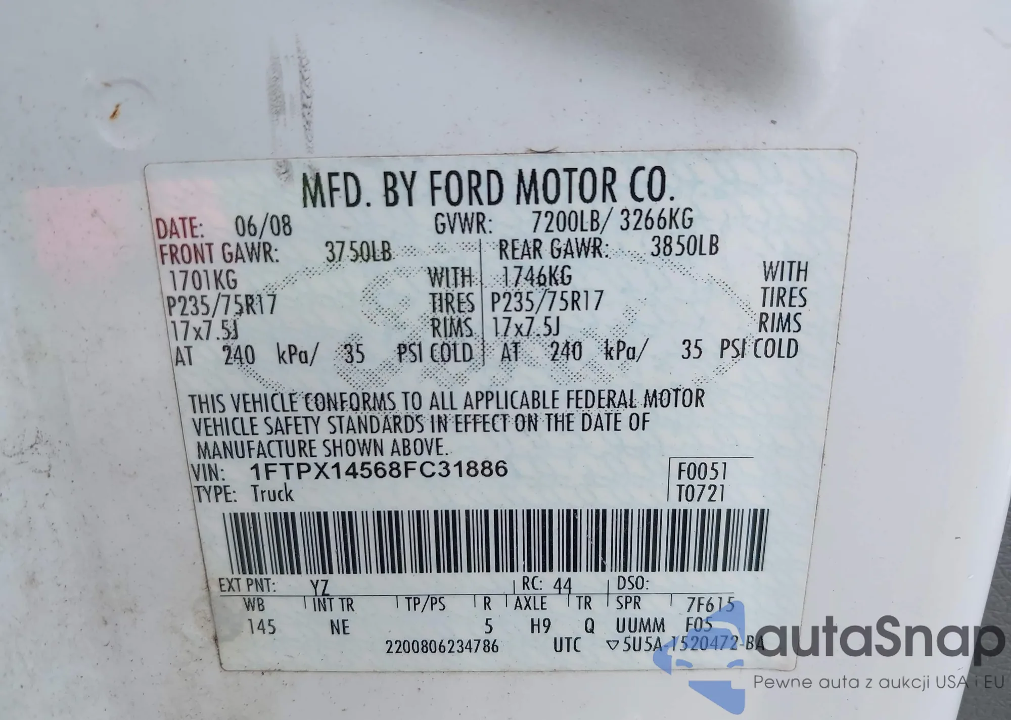 LOT: 43030062 VIN: 1FTPX14568FC31886