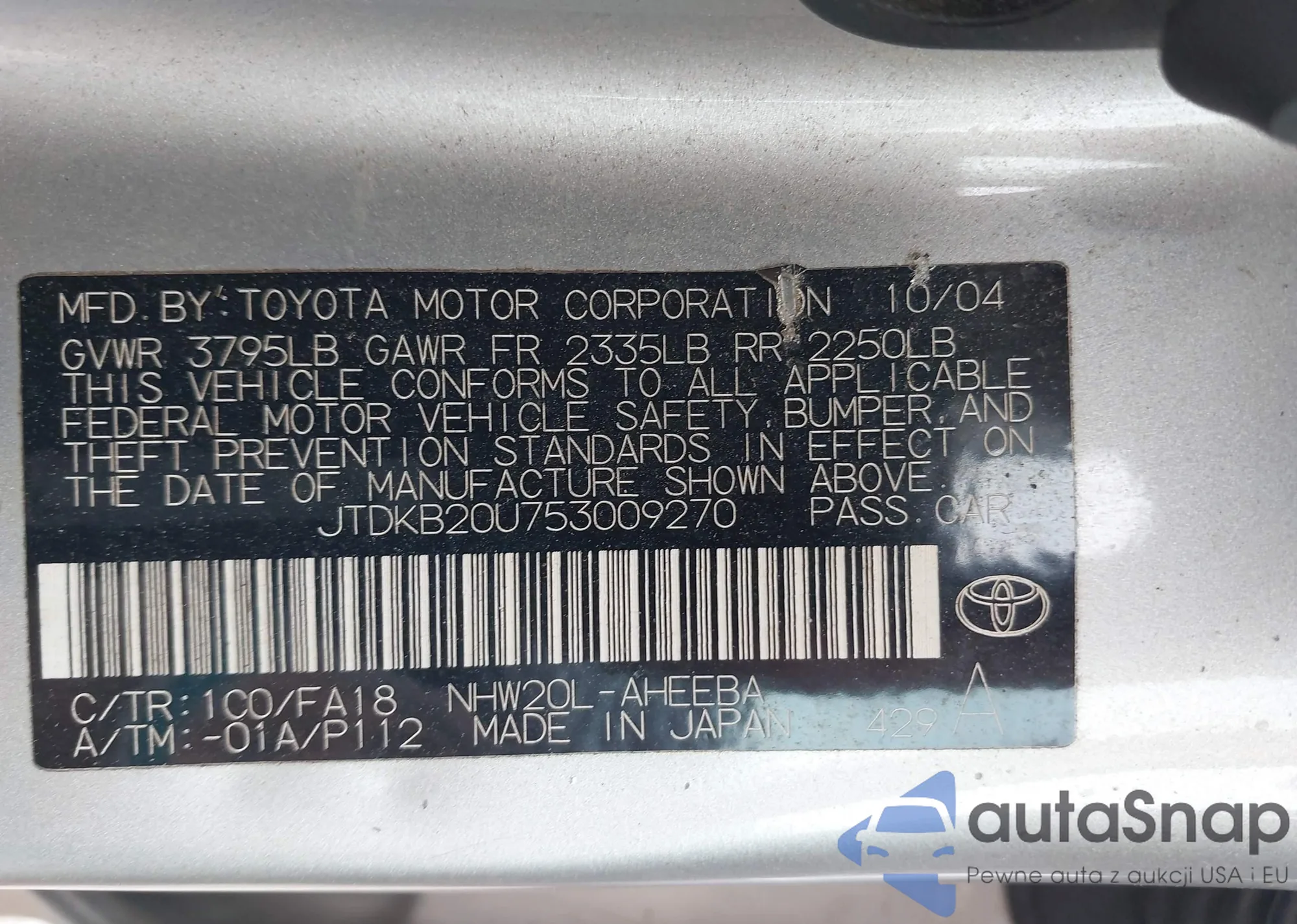 LOT: 43038349 VIN: JTDKB20U753009270