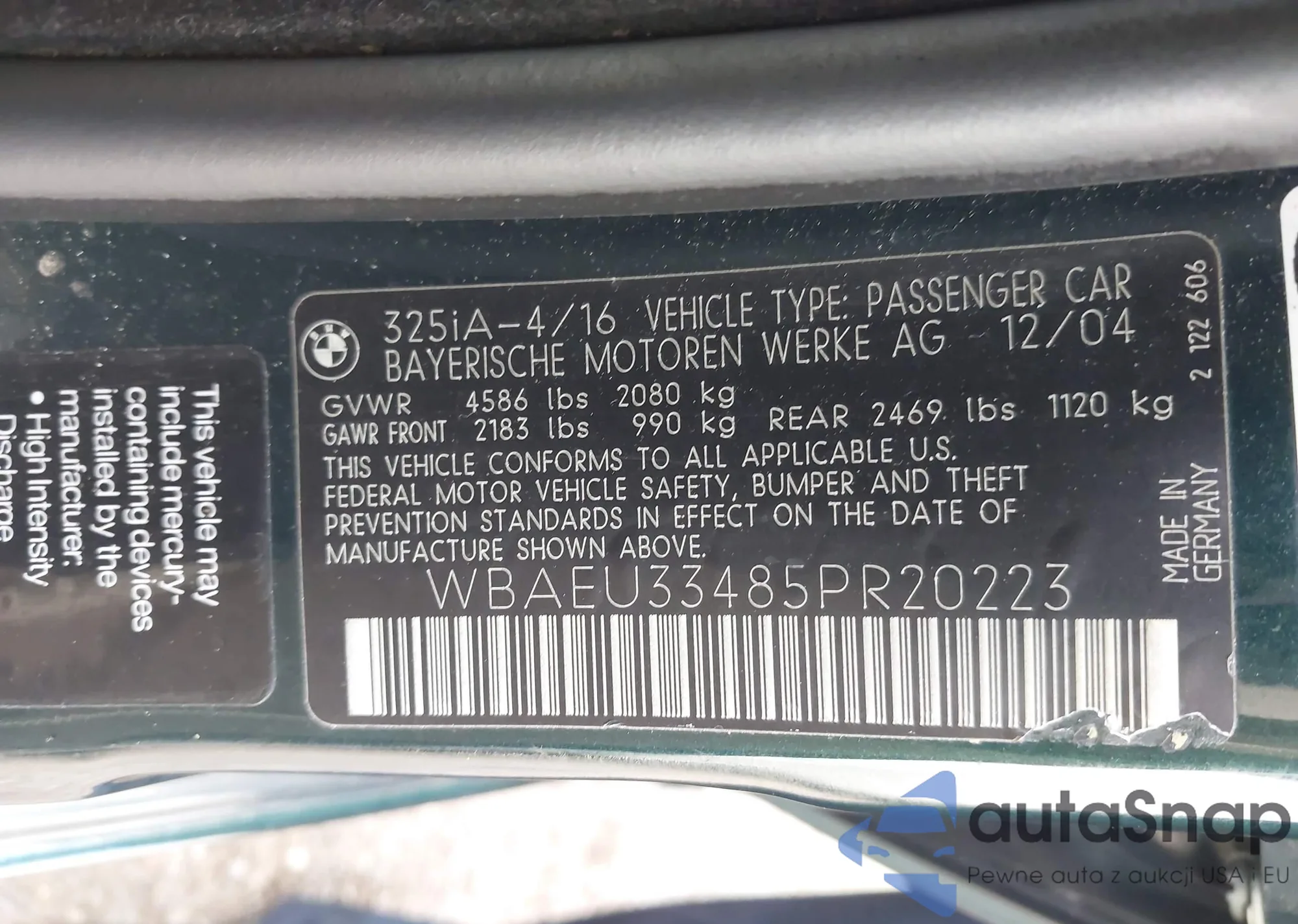 LOT: 42904927 VIN: WBAEU33485PR20223