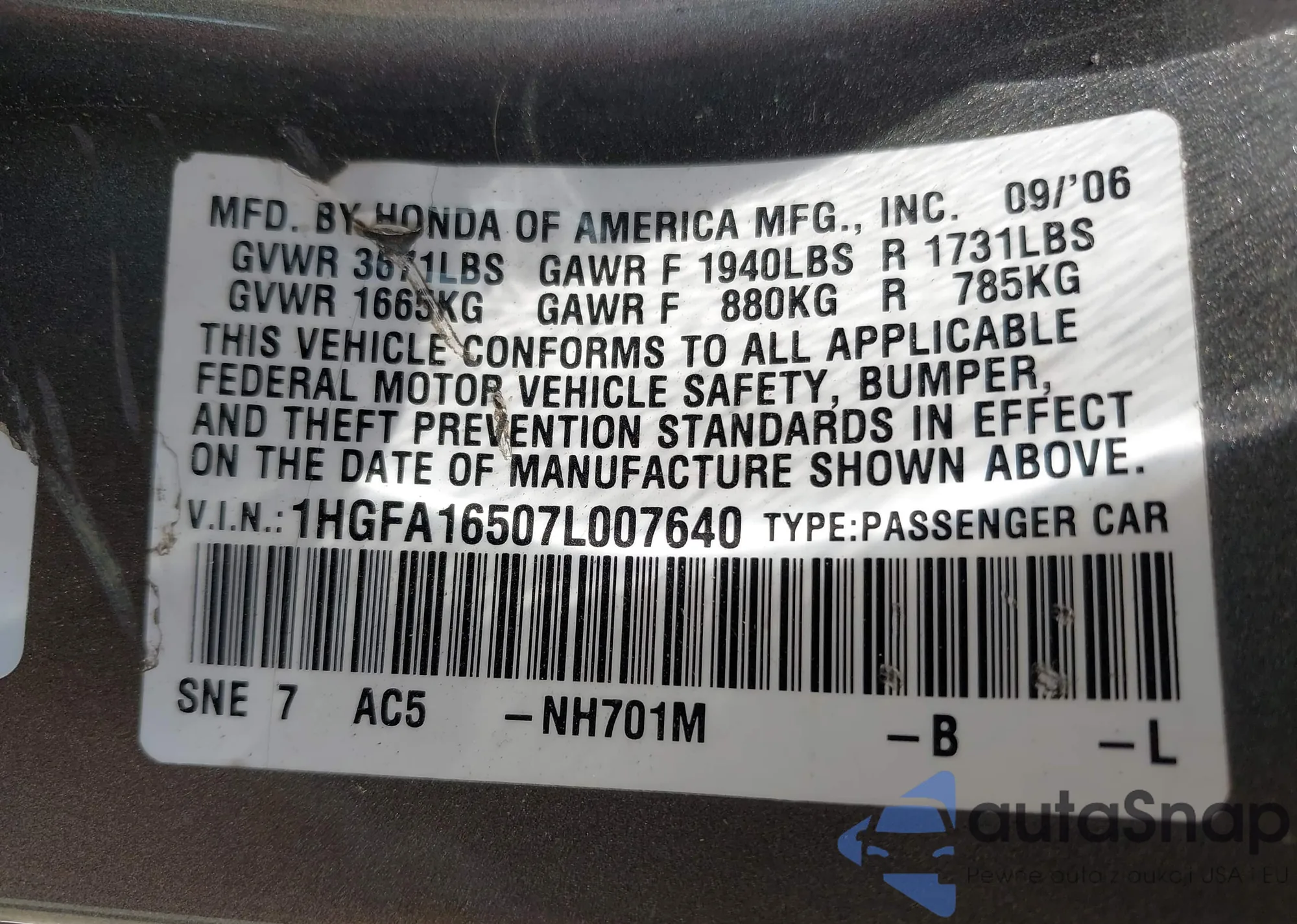 LOT: 43064656 VIN: 1HGFA16507L007640