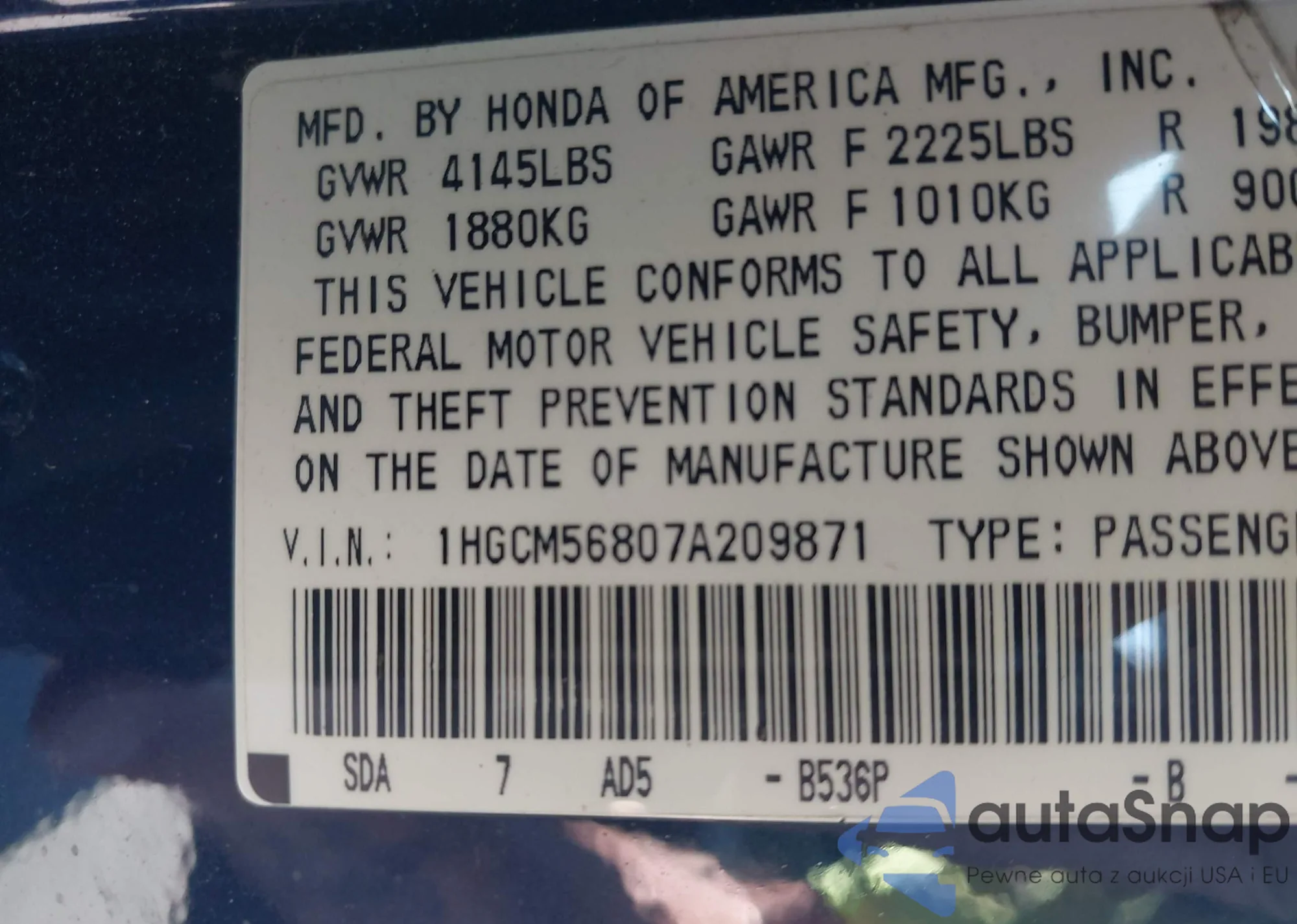 LOT: 43086231 VIN: 1HGCM56807A209871