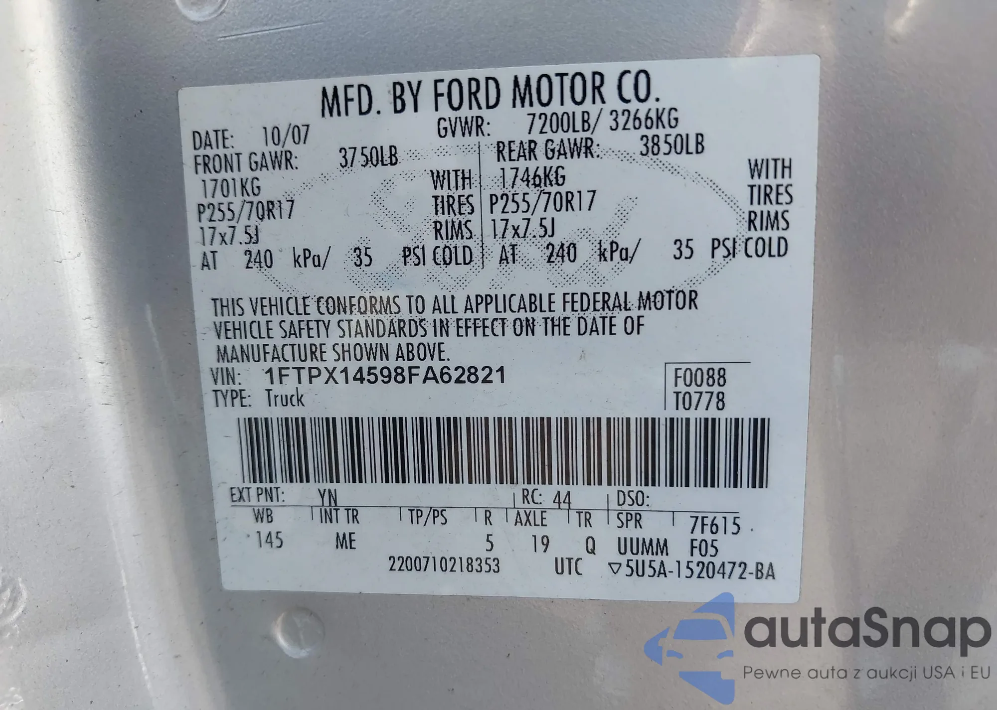 LOT: 43116594 VIN: 1FTPX14598FA62821