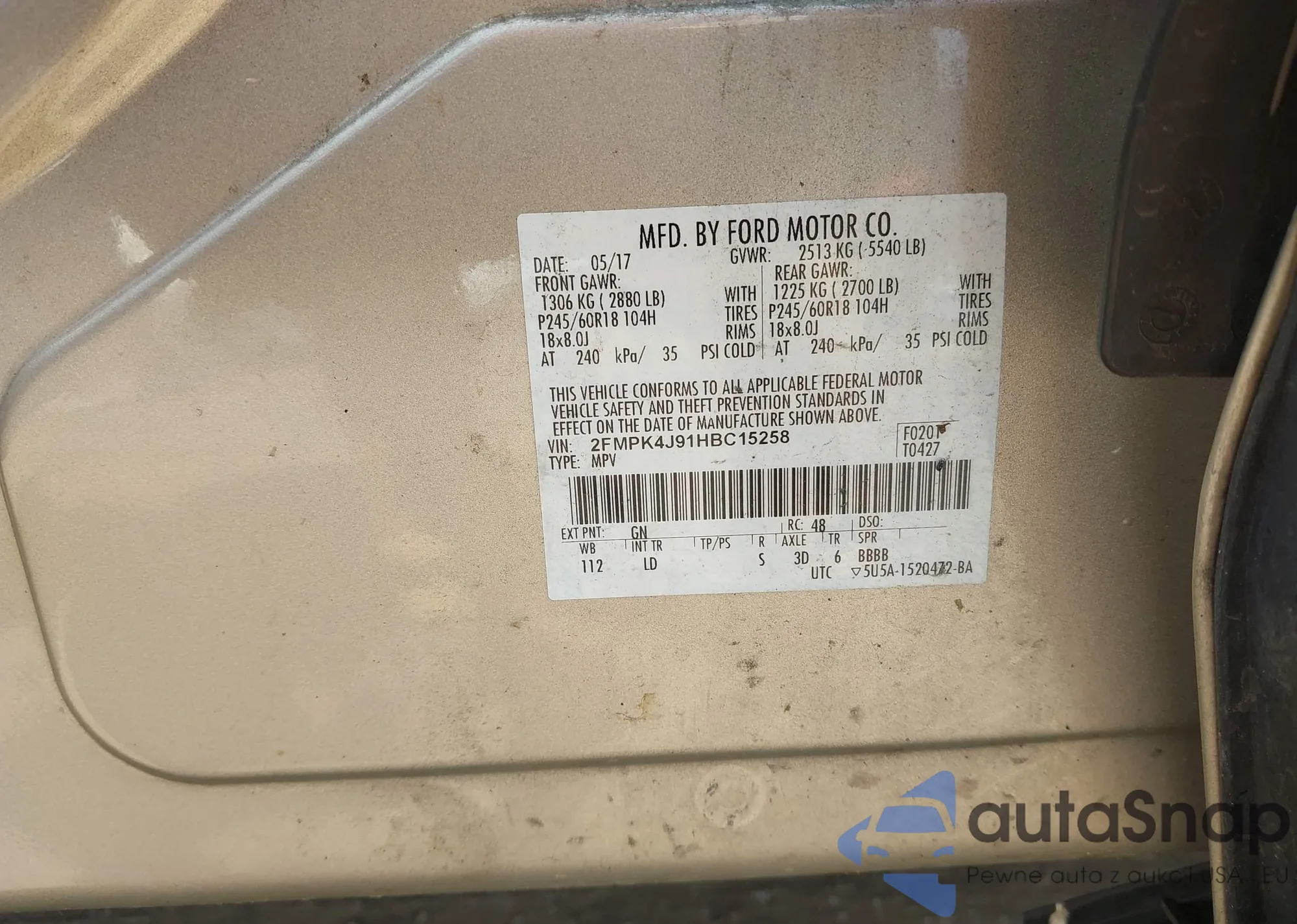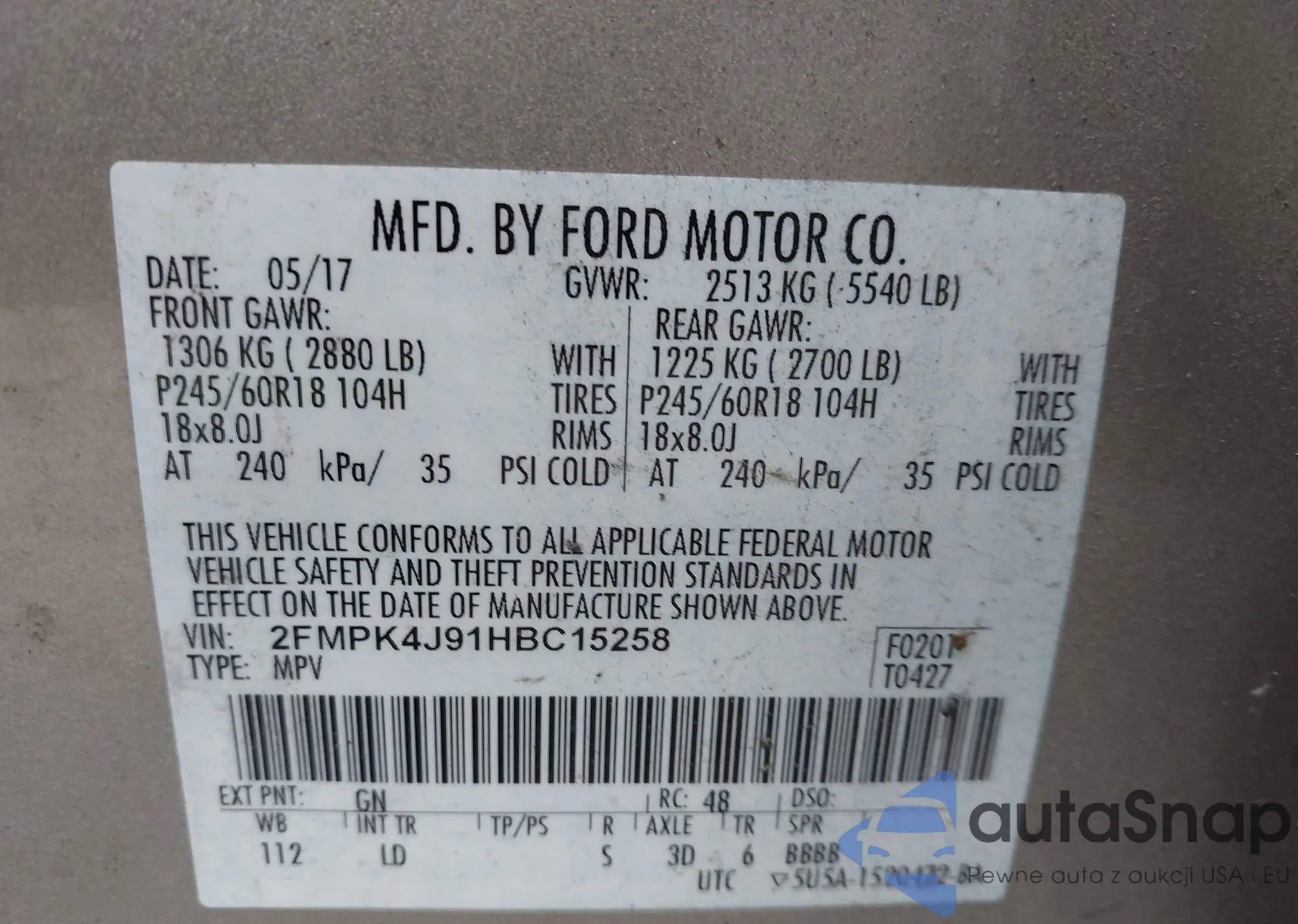 LOT: 42377076 VIN: 2FMPK4J91HBC15258