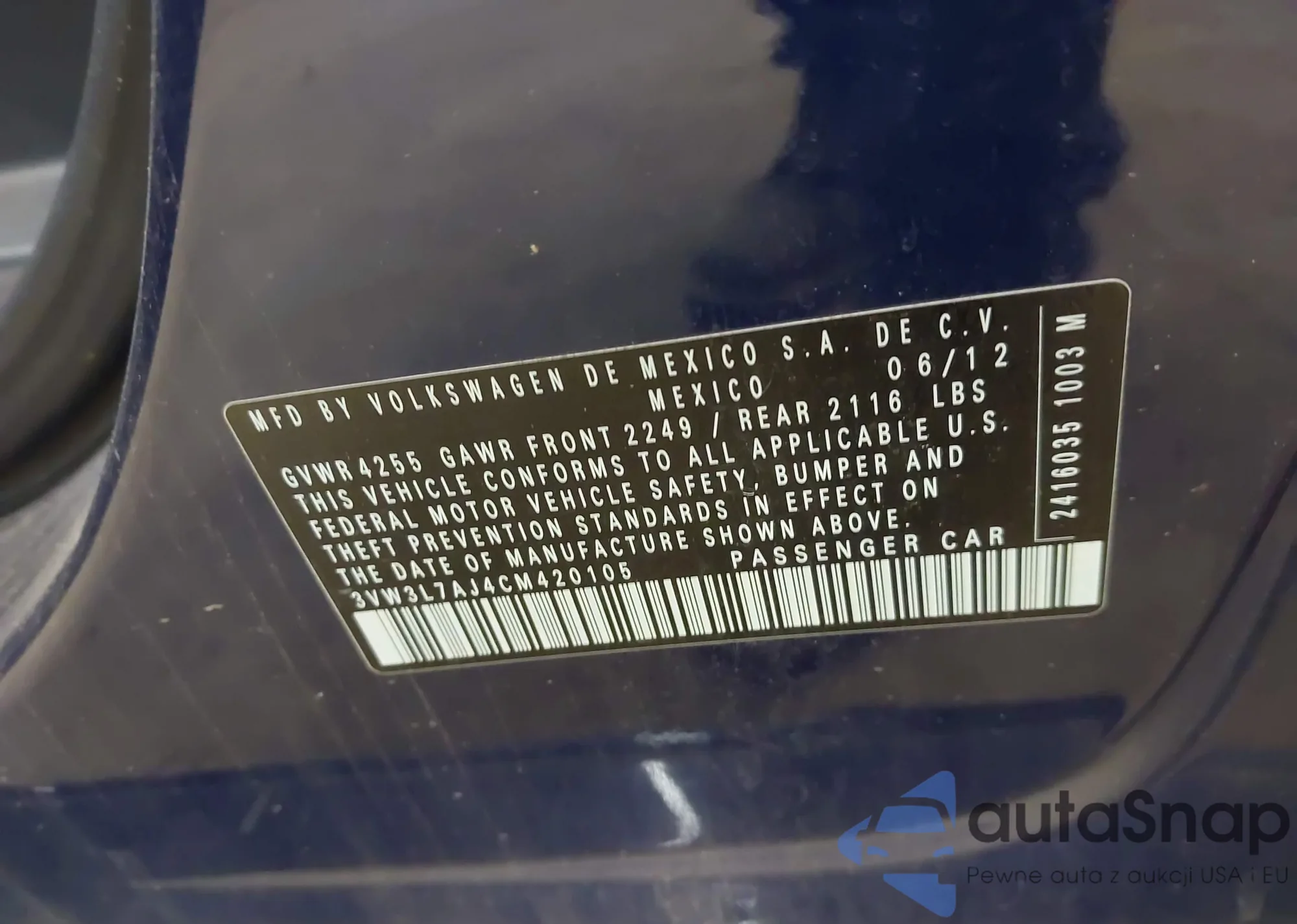LOT: 42424201 VIN: 3VW3L7AJ4CM420105