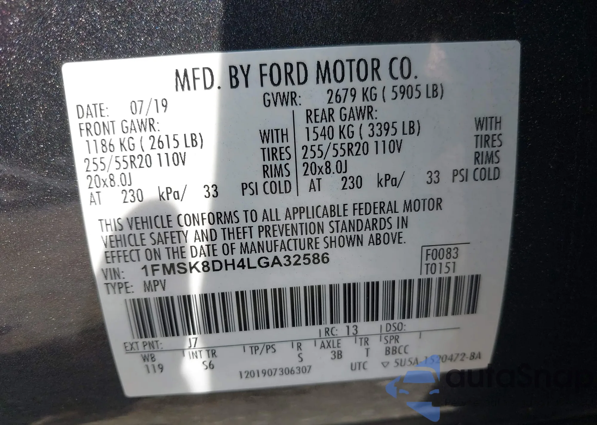 LOT: 42440517 VIN: 1FMSK8DH4LGA32586
