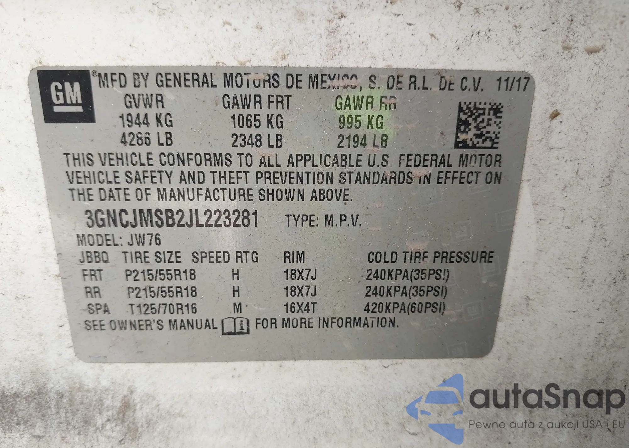 • VIN 3GNCJMSB2JL223281